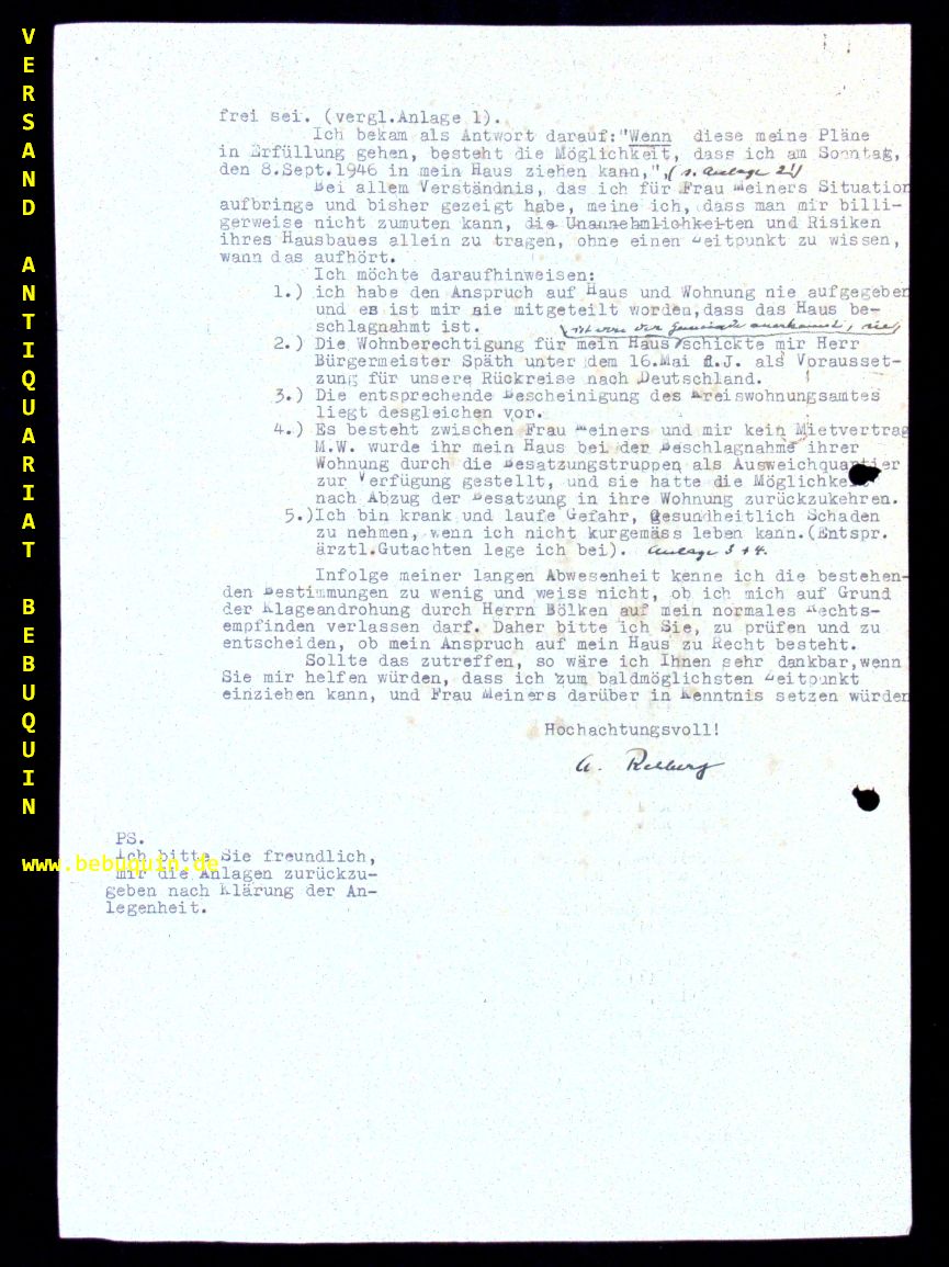WORPSWEDE.– REHBERG, Albert: 2seitiges sehr ausführliches eigenhändig signiertes ms-Schreiben an den Bürgermeister Späth: Am Sonntag erschien Senator Bölken aus Bremen, um mir zu eröffnen, daß es lediglich guter Wille seiner Schwester sei, wenn sie sich mit dem Bau so beeile (…) und ich mir darüber klar sein müsse „das heute der Hausbesitzer keinerlei Rechte hat, der Mieter dagegen jeden Schutz genießt.“. Worpswede, 1.9.1946. 1 Bl. seitlich gelocht.