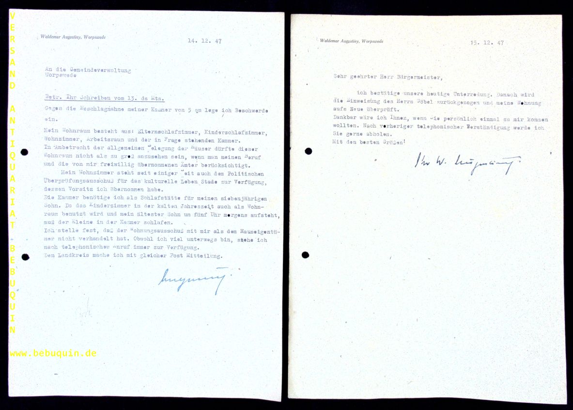 WORPSWEDE.– AUGUSTINY, Waldemar: 2 ms-Briefe mit eigenhändiger Signatur an den Bürgermeister von Worpswede. Es geht um die Beschlagnahme von Wohnraum für Flüchtlinge: Gegen die Beschlagnahme meiner Kammer von 5 qm lege ich Beschwerde ein. Worpswede, 14.12.1947. 2 Bl. seitlich gelocht. Waldemar Augustiny wuchs in einer schleswigschen Pastorenfamilie auf und studierte nach dem Abitur an der Domschule Schleswig in Kiel, Hamburg und Berlin Germanistik, Philosophie und Kunstgeschichte. Er war in beiden Weltkriegen Soldat und arbeitete in zahlreichen Berufen, so war er Werkstudent, Arbeiter, Angestellter, Verlagsredakteur (1925–1932), Buchhändler, Journalist (er schrieb für nationalsozialistische Zeitungen, nach dem Krieg über Kunst für die Hannoversche Allgemeine Zeitung). Von 1932 bis zu seinem Tod 1979 lebte er als freier Schriftsteller in Worpswede bei Bremen. (Wikipedia)