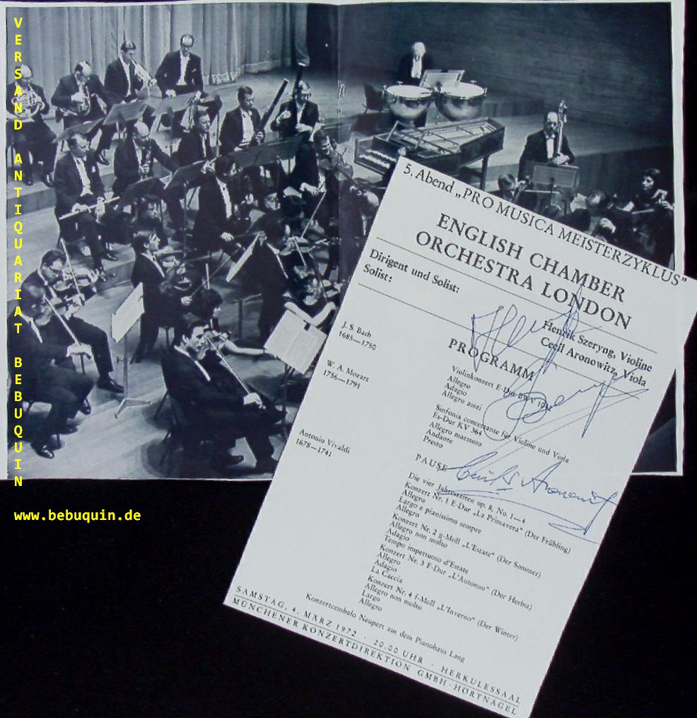 SZERYNG, Henryk (Violinist) + ARONOWITZ, Cecil (Bratschist): eigenhändig von beiden signierte Programmseite. München (Herkulessaal), 4.3.1972. 18 x 13 cm. 2 Bl. Henryk Szeryng (* 22. September 1918 in Warschau; † 3. März 1988 in Kassel) war ein polnisch-mexikanischer Geiger, Violinpädagoge, Herausgeber, Komponist und Diplomat, der seit 1946 in Mexiko lebte und seit dem 21. Oktober 1948 die mexikanische Staatsbürgerschaft hatte. Cecil Aronowitz (4 March 1916 – 7 September 1978) was a British viola player, a founding member of the Melos Ensemble, a leading chamber musician and an influential teacher at the Royal College of Music and the Royal Northern College of Music. (Wikipedia)