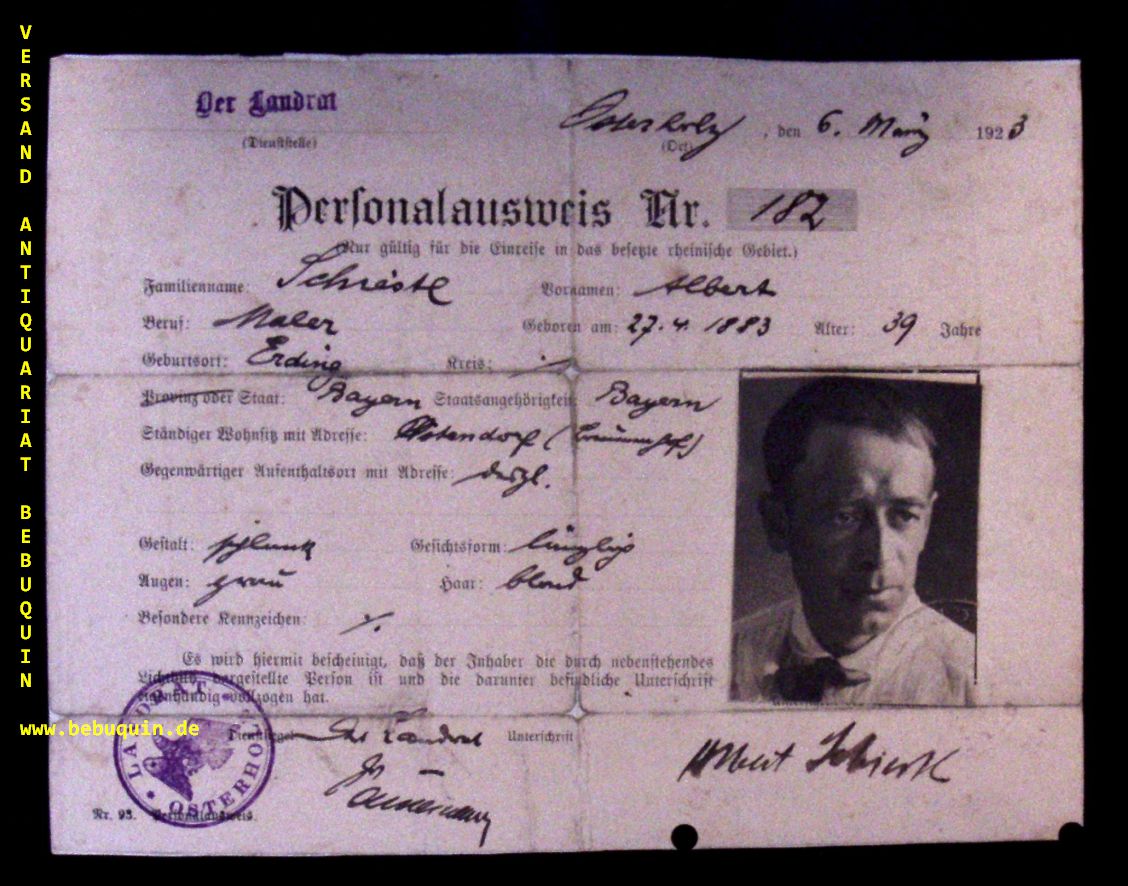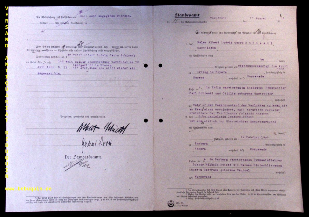 WORPSWEDE.– SCHIESTL, Albert Ludwig Georg: eigenhändig signierte persönliche Urkunden. I. Handschriftlich ausgefülltes Formular des Personalausweises mit Foto vom 6. März 1923. II. 4seitiges Aufgebotsverzeichnis vom 23. August 1926 des Malers Albert Ludwig Georg Schiestl und der Schauspielerin Irmgard Schott mit detailreichen biographischen Angaben und den eigenhändigen Unterschriften der beiden Eheleute. III. 3 Aufgebotsaushänge vom 25.– 30. August 1926 in Lilienthal, Worpswede und Oldenburg mit den entsprechenden Stempeln und Signaturen. IV. Staatsangehörigkeitsausweis der Irmgard Schott aus Hamburg vom 30. Juli 1926 sowie deren Aufenthaltsbescheinigung zum Zwecke der Eheschließung vom 30. Juni 1926. Worpswede, 3.3.1901. unterschiedliche Formate. insgesamt 7 Papiere seitlich gelocht mit Faltspuren. Albert Schiestl wurde 1883 in Erding geboren. Sein Leben lang hatte und malte Albert Schiestl Hunde, denn „ohne Hund kann ich nicht leben“, meinte er. Nach einem gescheiterten Versuch, nach Amerika auszuwandern arbeitete er in Bremen zunächst als Dekorationsmaler, danach in einem Fotostudio. Dort lernte er seine spätere Ehefrau, die Kunstmalerin Annemarie Holländer kennen, 1913 kam Töchterchen Liselotte zur Welt. Nach dem Ersten Weltkrieg zog Albert Schiestl zu Ehefrau und Tochter nach Worpswede und genoss die Gesellschaft der berühmten Künstler der Kolonie. Allerdings nahm sein Leben eine traurige Wendung: Er trennte sich von seiner Frau, dann brannte seine Unterkunft in Worpswede beim sogenanneten Brunnenhofbrand ab, und er verlor alles, was er besaß. Er zog in den Harz, wo er sich mit Malen und Gelegenheitstätigkeiten über Wasser hielt. In unerträglicher Lage nahm er einen von Freunden arrangierten Aufenthalt in einem Nervensanatorium dankbar an. Gestärkt nahm er wieder an Ausstellungen teil und signierte seither mit dem Namen Albert Schiestl-Arding als Reminiszenz an seine Geburtsstadt. Er heiratete 1926 die Schauspielerin Irmgard Schott. Nach der Geburt von Tochter Nora erlebte er eine große Schaffenskraft. 1935 wurde Sohn Thomas geboren. Am 14. Februar 1937 starb Albert Schiestl-Arding; begraben ist er in Worpswede. (Wochenblatt)