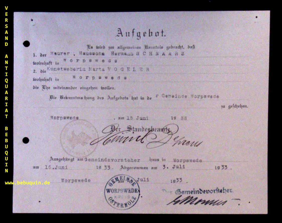 WORPSWEDE.– VOGELER, Martha: 4seitiges eigenhändig signiertes Aufgebotsverzeichnis von Martha (Mascha) Vogeler, der Tochter von Marta Vogeler + Hermann Schnaars. Es erschien heute und beantragte das Aufgebot zur Eheschließung der Maurer Hermann Schnaars und die Kunstweberin Marta Vogeler, Tochter von geschiedenen Eheleuten: Kunstmaler Johann Heinrich Vogeler und Marta geborene Schröder. Ersterer in Berlin-Britz zur Zeit in Russland, letztere wohnhaft in Worpswede. Mit allen Stempeln und Unterschriften der Beamten. Beiliegend der Aushang des Aufgebots für Worpswede mit Stempeln und Unterschriften. Worpswede, 13.Juni 1933. Gr. 4°. 1 Doppelbogen + 1 Bl. seitlich gelocht, gute Ex. Rares Dokument über die Tochter Heinrich und Marta Vogelers Mascha. Am 7. Dezember kommt in Worpswede die dritte Tochter, Martha (genannt Mascha) zur Welt. Mascha wird eine Ausbildung als Weberin für Gebrauchstextilien absolvieren. Sie stirbt 1993 in Worpswede.