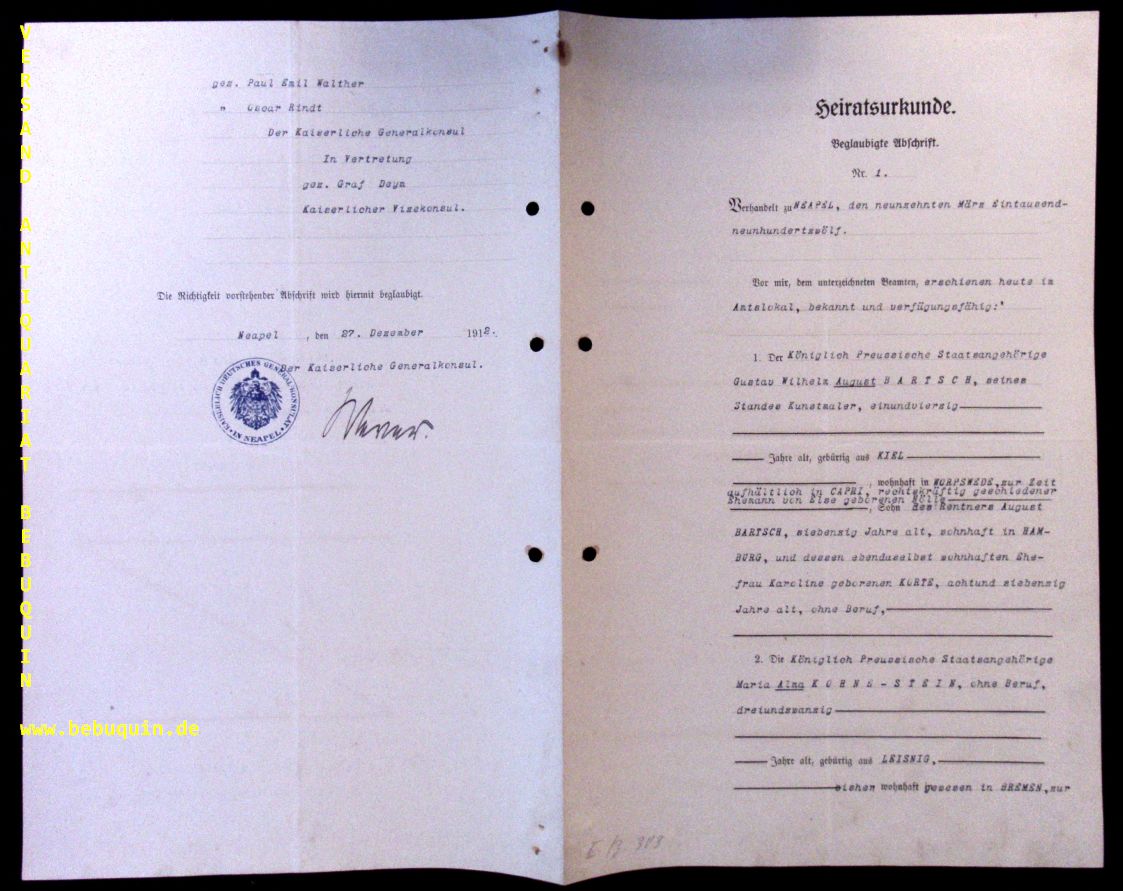 WORPSWEDE.– BARTSCH, Wilhelm: Heiratsurkunde des Kunstmalers Gustav Wilhelm August Bartsch mit Maria Alma Kühne-Stein in beglaubigter Abschrift. August Bartsch, wohnhaft in Worpswede, zur Zeit aufhältlich in Capri, rechtskräftig geschiedener Ehemann von Else geborene Nölle und Alma Kühne-Stein, gebürtig aus Leisnig, Tochter des im unbekannten Ort verstorbenen Hutmachers Johan Heinrich Stein und dessen ebenfalls verstorbenen Ehefrau an Kindesstatt angenommen von der in Bremen wohnhaften unverehelichten Anna Mathilde Kühne. Verhandelt am 19.3.1912. Neapel, 27.12.1912. Gr. 4°. Doppelblatt. seitlich gelocht. Dabei das offizielle Begleitschreiben des Landrats Osterholz an das Standesamt in Worpswede vom 12. Februar 1913. Wilhelm Bartsch (* 3. März 1871 in Kiel; † 30. Juni 1953 in Hannover) war ein deutscher Landschafts- und Marinemaler der Düsseldorfer Schule. Nach 1909 wurde er Teil der zweiten Generation der Künstlerkolonie Worpswede. (Wikipedia)
