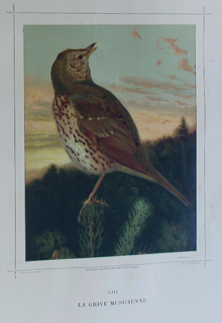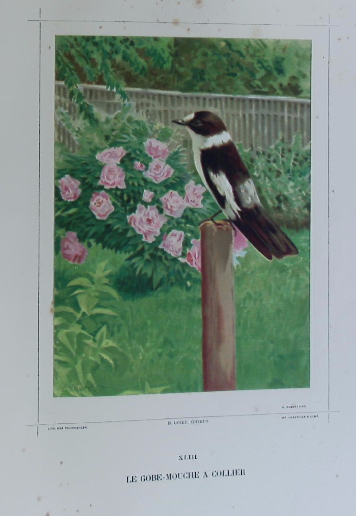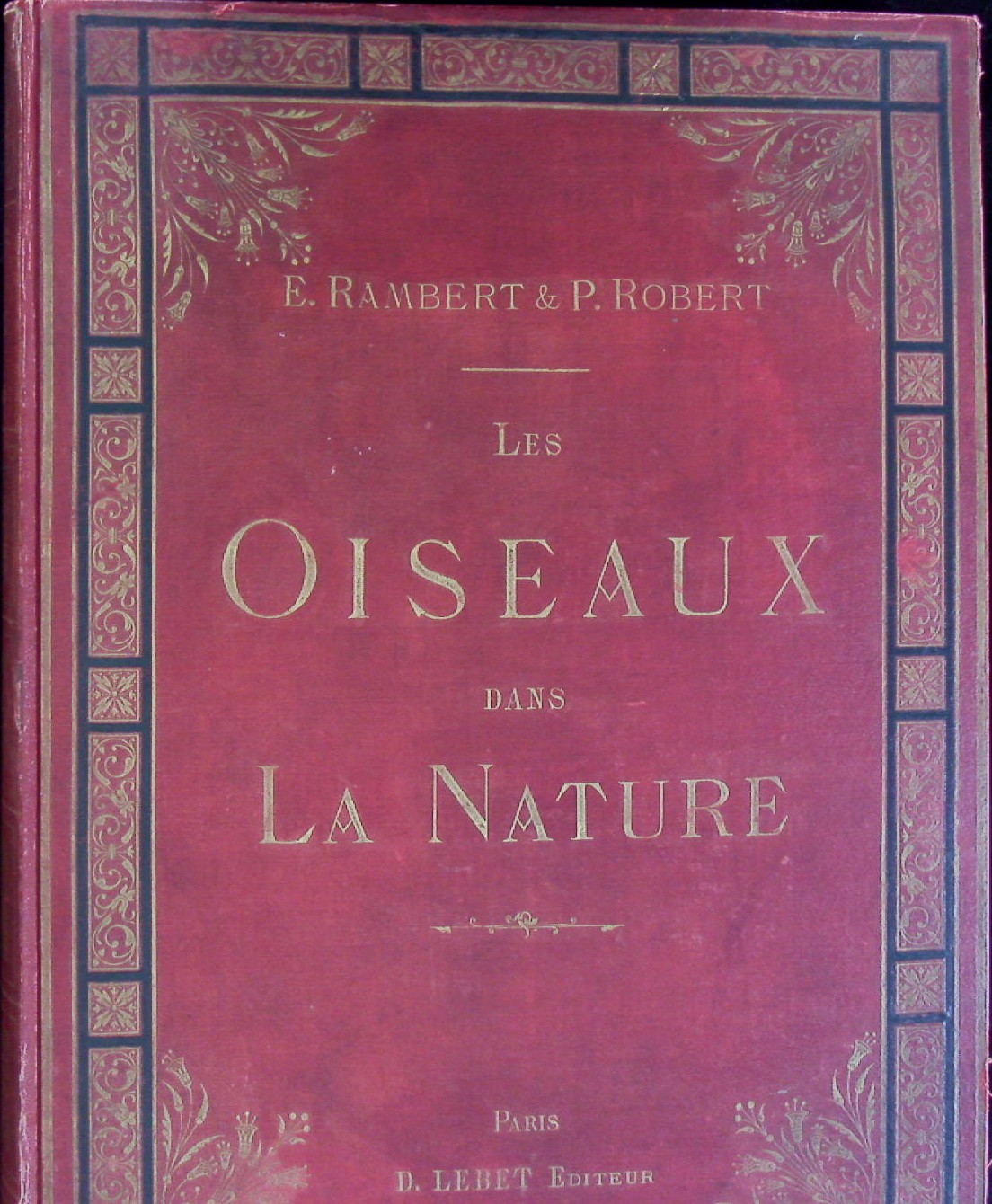 ORNITHOLOGIE.– RAMBERT, Eugene: Les oiseaux dans la nature. Description pittoresque des oiseaux utiles. Paris (Lebet), 1878. Fol. 63, 60, 50 Bl. mit 60 mont. Farbtafeln, 50 gravures sur bois hors texte et 122 gravures dans le texte d’après les aquarelles et les dessins de Léo Paul Robert. reich verziertes OHLdr. neu aufgezogen. Kanten etwas berieben, die Bindung etwas gelockert, die Tafeln teils, aber zumeist im unbedruckten Randbereich stockfleckig, wenige Tafeln stärker gebräunt, die mont. Farbblätter in aller Regel nicht betroffen. Seltene komplette Ausgabe des gesuchten Werks. Nissen, IVB 783. – Die schönen Tafeln nach Aquarellen und
