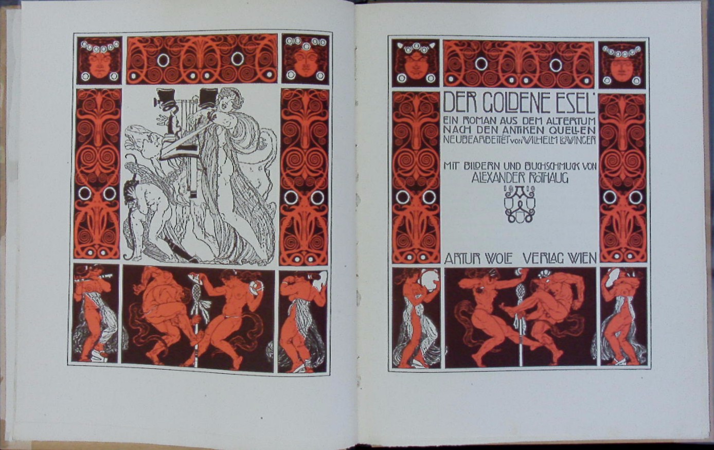 LÖWINGER, Wilhelm: (Hrsg.) Der goldene Esel. Ein Roman aus dem Altertum nach den antiken Quellen neubearb. Wien (Artur Wolf), 1918. 4°. 60 S. mit 8 farb. Bildtafeln und zahlr. Textabb. von Alexander Rothaug. OHLdr mit Deckelvignette und goldgeprägtem Rücken. Kapitale minimal berieben, gutes Ex. Nr. 731 von 1200 Ex. dieser einmaligen Auflage auf handgeschöpftem Büttenpapier.