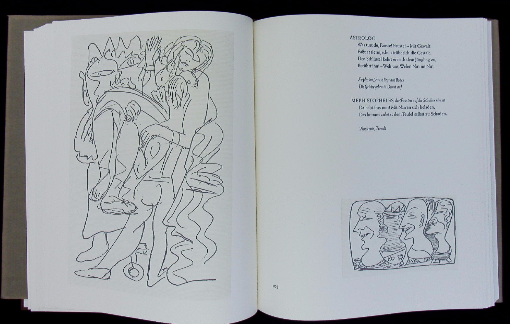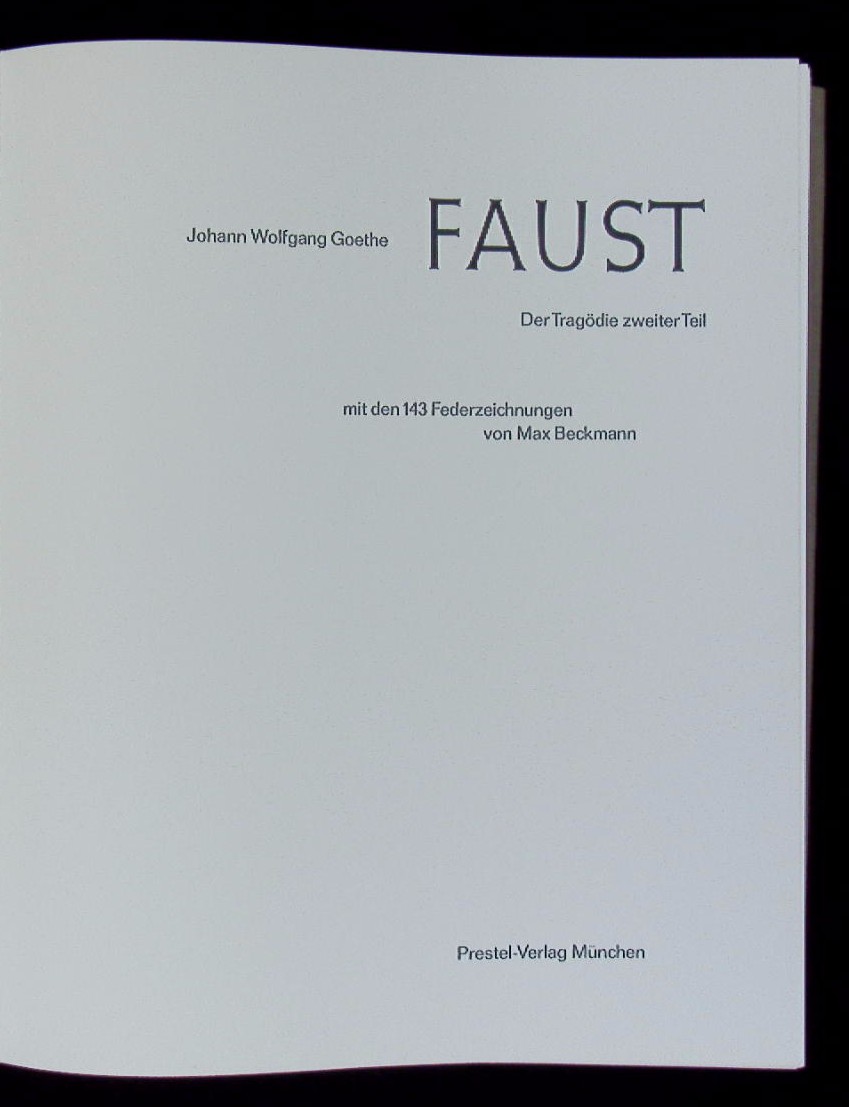 BECKMANN.– GOETHE, Johann Wolfgang von: Faust. Der Tragödie zweiter Teil. München (Prestel), 1970. 4°, 411 S. mit 143 Federzeichnungen von Max Beckmann. OLdr mit OUmschl. tadellos. Nr. 86 von 300 numerierten Ex. von Sonnfriede Scholl in Leder gebunden.