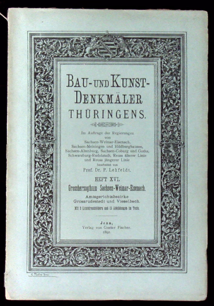 THÜRINGEN.– LEHFELDT, Paul: Großherzogtum Sachsen – Weimar – Eisenach. Amtsgerichtsbezirke Grossrudestadt und Vieselbach. Jena (Gustav Fischer), 1892. 4°. IV, 94 S. mit 2 Lichtdruckbildern und 13 Abbildungen im Texte. ill. OKart. NaT, Rücken gebrochen, unbeschnitten, sonst gut erhalten. = Die Bau- und Kunst-Denkmäler Thüringens. Heft XVI. EA.