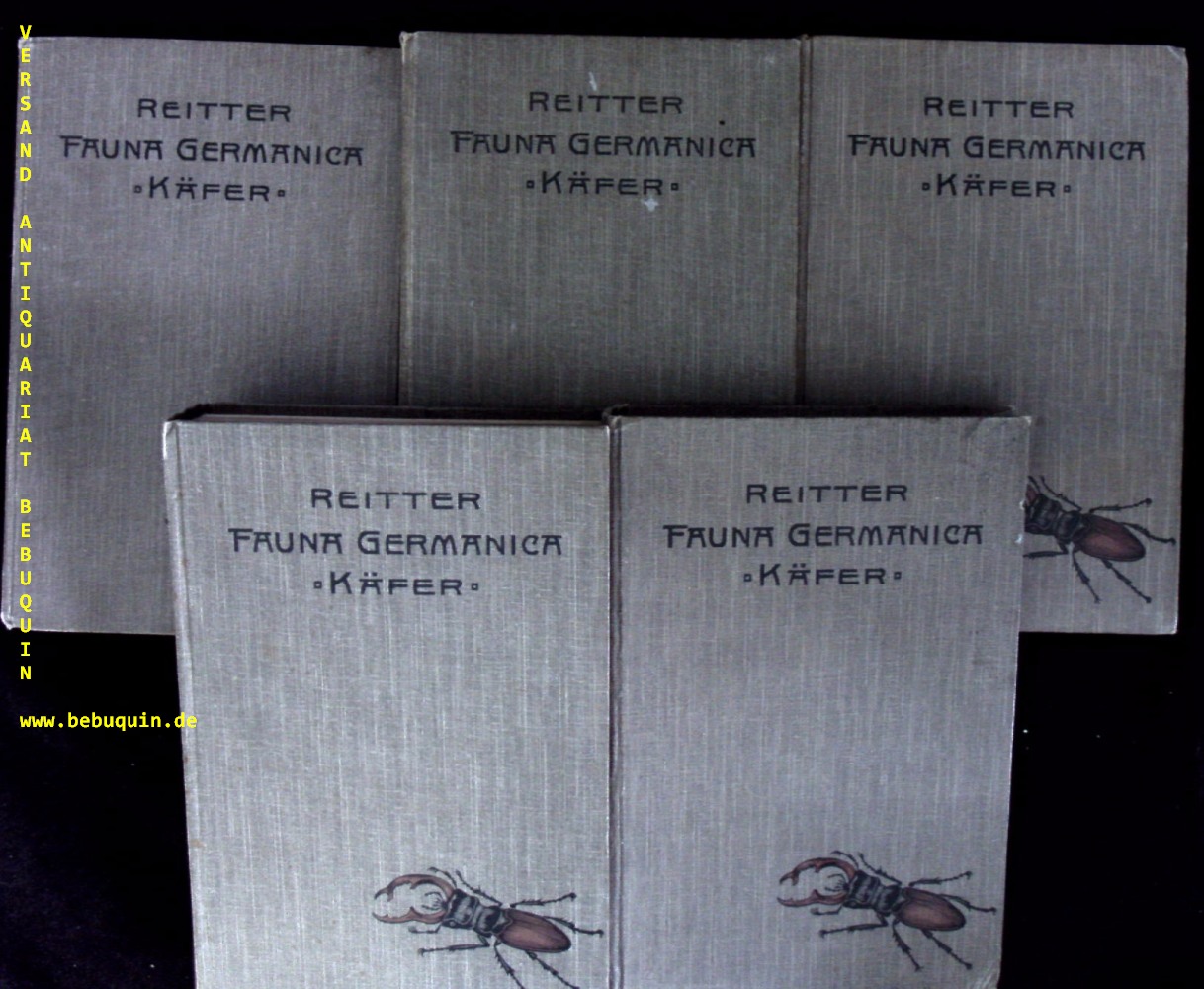 ZOOLOGIE.– REITTER, Edmund: Fauna Germanica. Die Käfer des Deutschen Reiches. Nach der analytischen Methode bearbeitet. 5 Bände. Stuttgart (Lutz), 1908 – 1916. Gr. 8°. ca 1300 S. mit 66, 70, 147, 31 und 18 Textill. + 40, 40, 48, 22 und 16 Farbendrucktafeln. ill. OLn. gelegentlich im vorderen Gelenk gelockert, insgesamt gut. Das Standardwerk zur Käferkunde. Nissen ZBI,3359.
