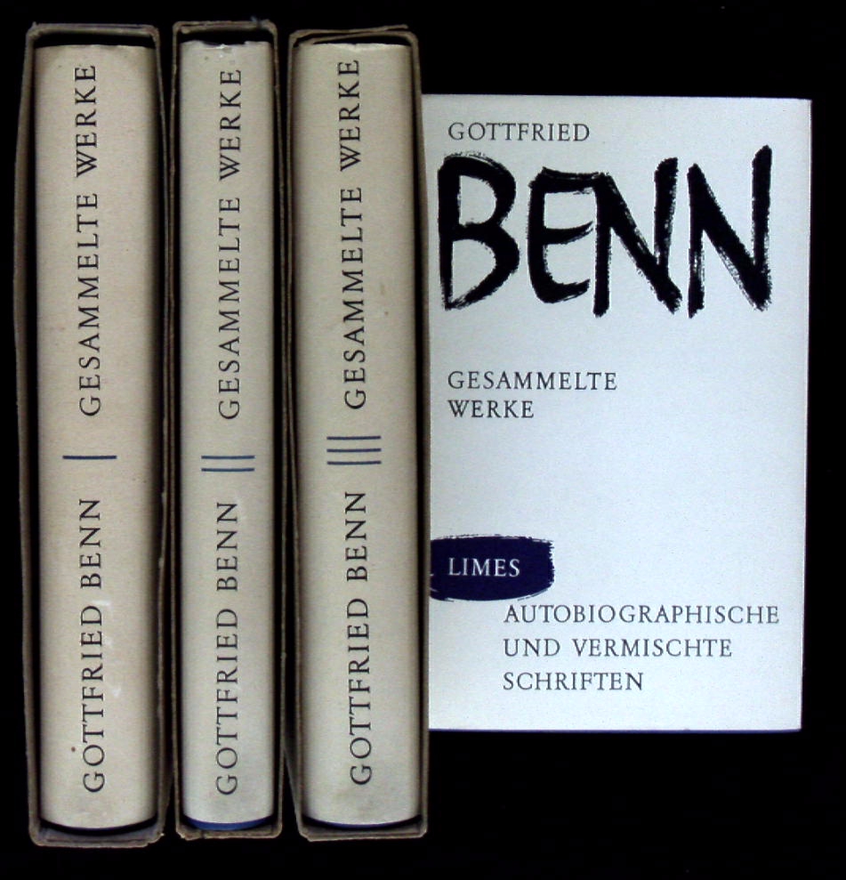 BENN, Gottfried: Gesammelte Werke. Herausgegeben von Dieter Wellershoff. 4 Bände. Wiesbaden (Limes), 1958 – 1961. ca 2000 S. OLn mit OUmschl in OSchuber. tadellos. Die gesuchte Werkausgabe des Dichterarztes in einem tadellosen Exemlar der EA. WG² 57.
