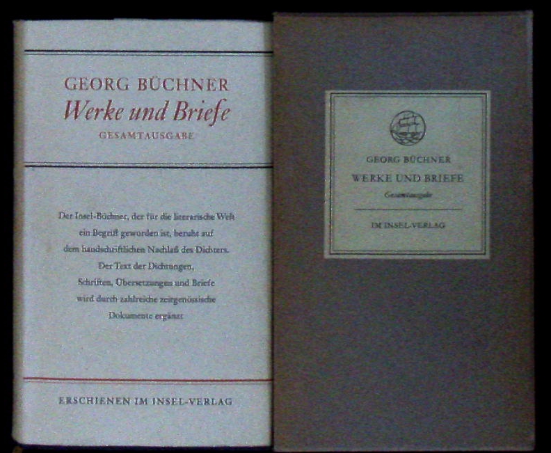 BÜCHNER, Georg: Werke und Briefe. Gesamtausgabe. Neue durchgesehene Ausgabe. Leipzig (Insel), 1958. 682 S. Dünddruck. OLn. mit OUmschl. in OSchuber. Diese von Fritz Bergemann hrsg. Ausgabe wird bei Hagen als „wichtig“ bezeichnet, „da sie die einzige mit dem Varriantenapparat ist.“