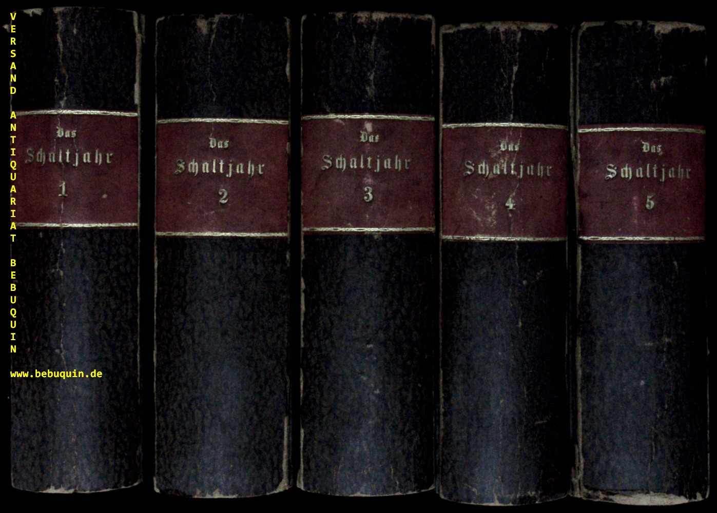 GRENZWISSENSCHAFTEN .– SCHEIBLE, Johann: (Hrsg.) Das Schaltjahr; welches ist der teutsch Kalender mit den Figuren, und hat 366 Tag. 5 Bände (so komplett). Stuttgart (Thomas), 1846/47. kl. 8°. 656, 732, (2), 742, (2), 720, 725, (3) pp. mit 104 teils gefalteten lithogra. Bildtafeln und zahlr. Textabb. einheitliche Pb der Zeit mit goldgeprägten Rückenschildern. Kanten etwas berieben, insgesamt sehr gut erhalten. EA. Graesse VI, 297. Krieg MNE II, 202. Hayn-G. VII, 123 f.: „Ein mit einer Menge Curiositäten u. Seltenheiten in Wort und Bild schön ausgestattetes Werk, das derjenige, welcher sich mit dem Sammeln culturgeschichtlicher u. literarischer Raritäten befasst, nicht wird entbehren können“. Die Taf. tls. nach Holzschn. von Dürer, J. Amman, H. Scheufelein u.a.