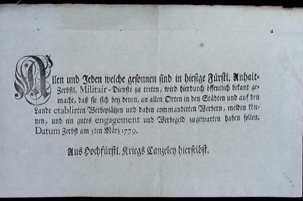 ZERBST.– FRIEDRICH AUGUST I. (1. KÖNIG VON SACHSEN): Anwerbung für den Militärdienst in Zerbst 1779. “…Allen und Jeden welche gesonnen sind in hiesiger Fürstl. Anhalt-Zerbstl. Militair-Dienste zu treten . . . ein gutes engagement und Werbegeld zugewarten haben wollen.″ Zerbst, 30.11.1768. Quer Gr. 4°. 1 Bl. auf Hadernbütten mit gestochenen Majuskeln. feines Ex. Friedrich August I. Joseph Maria Anton Johann Nepomuk Aloys Xaver „der Gerechte“ (* 23. Dezember 1750 in Dresden; † 5. Mai 1827 ebenda) war seit 1763 als Friedrich August III. Kurfürst und von 1806 bis zu seinem Tod erster König von Sachsen. Er wurde 1791 zum König von Polen gewählt, amtierte jedoch nur von 1807 bis 1815 als Herzog von Warschau.