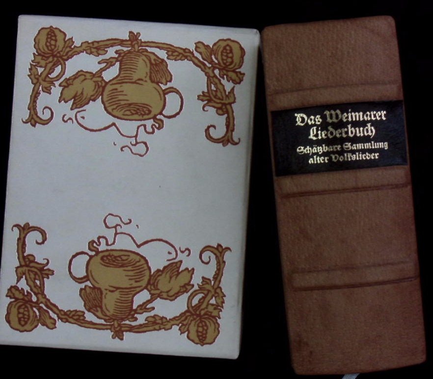 LEIPZIG.– KÜSTER, Volker: (Gestaltung) Das Weimarer Liederbuch. Schätzbare Sammlung alter Volkslieder. Neudruck Nachw.: Konrad Kratzsch. Leipzig (Edition Leipzig), 1976. kl. 8°. 751, 56 S. mit zahlr. Holzschnittill. OKunstleder mit goldgeprägtem Rückenschild in OSchuber. feines Ex. 1. Aufl. dieser Ausgabe.