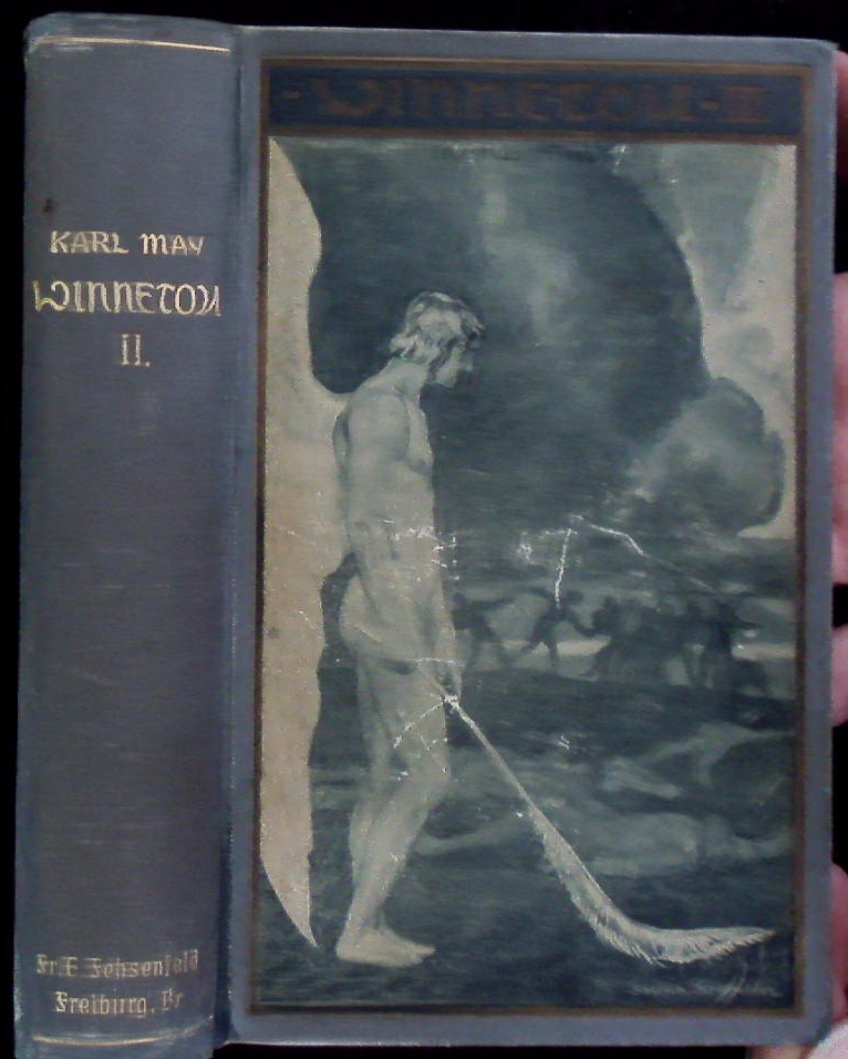 MAY, Karl: Winnetou. II. Band. 46.– 50. Tsd. Freiburg (Fehsenfeld), (1905). 630 (1) S. mit den goldenen Vorsatzpapieren. ill. graues OLn von Sascha Schneider. DB 55. Vorderdeckel mittig etwas beschabt, insgesamt dennoch gutes Ex. = Gesammelte Reiseerzählungen, Bd. VIII.