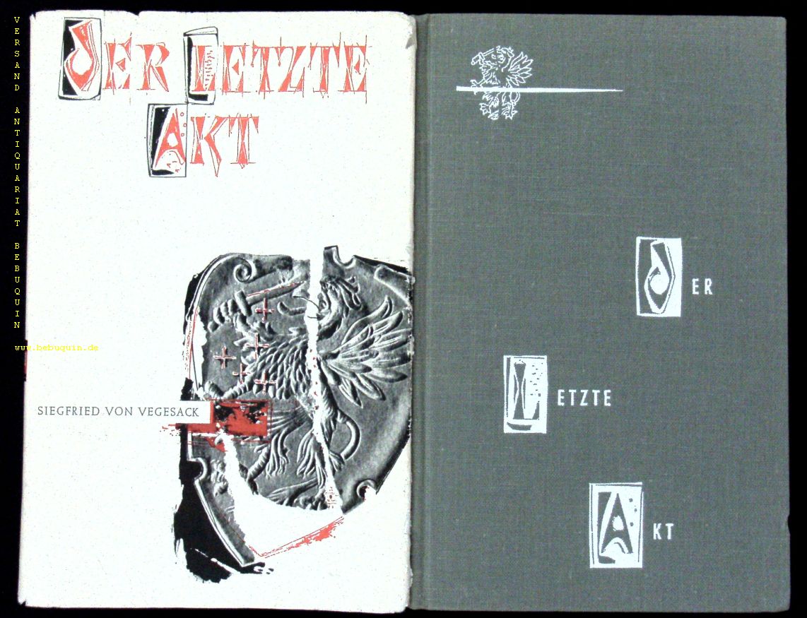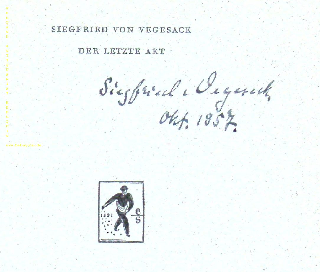 VEGESACK, Siegfried von: Der letzte Akt. Heilbronn (Salzer), 1957. 282 (4) S. OLn mit OUmschl. gutes Ex. EA WG² 41 mit der eigenhändigen datierten Signatur des Dichters auf Vortitel.