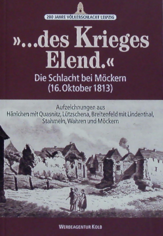 LEIPZIG.– GRAF, Gerhard: (Hrsg.) „… des Krieges Elend“. Die Schlacht bei Möckern (16. Oktober 1813) ; Aufzeichnungen aus Hänichen mit Quasnitz, Lützschena, Breitenfeld mit Lindenthal, Stahmeln, Wahren und Möckern ; 200 Jahre Völkerschlacht Leipzig. Leipzig (Werbeagentur Kolb), 2012. 87 S. mit zahlr. Abb. ill. OKart. tadellos. EA.