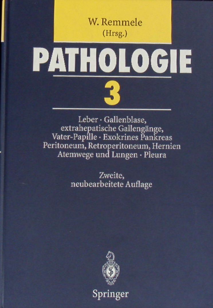 MEDIZIN.– HARTUNG / KLINGE / KLÖPPEL / MÜLLER / REMMELE: Leber, Gallenblase und extrahepatische Gallengänge, Vater-Papille, Exokrines Pankreas, Peritoneum, Retroperitoneum, Hernien, Atemwege und Lungen, Pleura. 2., neubearb. Aufl. Berlin (Springer), 1997. 4°. 759 S. mit 248 teils farb. Bildern und 59 Tabellen. OPb. NaV. Pathologie. Ein Lehr- und Nachschlagebuch / hrsg. von W. Remmele, 3. Band.