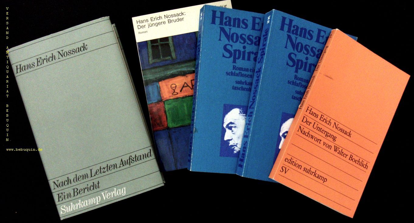 NOSSACK, Hans Erich: : Nach dem letzten Aufstand. Ein Bericht. Frankfurt (Suhrkamp), 1961. 366 (2) S. OLn mit OUnschl. tadellos. EA WG² 21 mit der Signatur des Dichters auf Vorsatz. Beigegeben: 4 ebenfalls von Nossack eigenhändig signierte Werke. zusammen 5 Bände für
