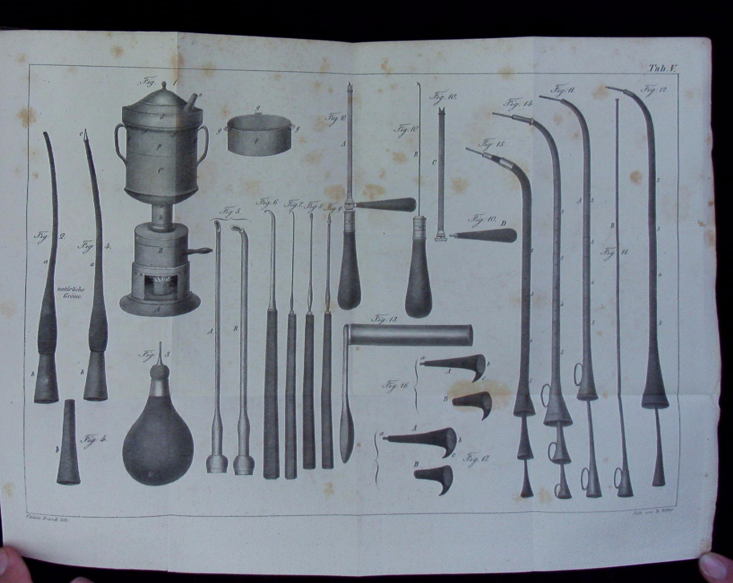 MEDIZIN.– WOLFF, Philipp Heinrich: Die Nervenkrankheiten des Ohrs, die Taubstummheit und die Ohrenoperationen. Leipzig (Hinrichs), 1845. 8°. XIV, 416 S. + 4 mehrfach gefaltete lithographischen Tafeln mit sehr zahlr. Abb. von Instrumenten und dem Taubstummenalphabet. Hldr der Zeit. Kanten leicht berieben, Rückenschild, StaV, StaT, vereinzelt braunfleckig. = Handbuch der theoretischen und praktischen Ohrenheilkunde / Carl Gustav Lincke, Bd. 3. EA dieses frühen Titels zu Ohrenoperation und Taubstummheit. Lesky 396.