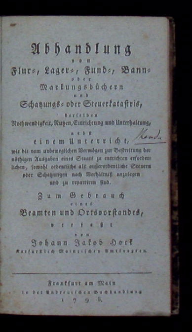 WIRTSCHAFT.– HOCK, Johann Jakob: Abhandlung von Flur-, Lager-, Fund-, Bann- oder Markungsbüchern und Schatzungs- oder Steuerkatastris, derselben Nothwendigkeit, Nutzen, Einrichtung und Unterhaltung. Nebst einem Unterricht, wie die vom unbeweglichen Vermögen zur Bestreitung der nöthigen Ausgaben eines Staats zu entrichten erforderlichen, sowohl ordentliche als außerordentliche Steuern oder Schatzung nach Verhältniß anzulegen und zu repartiren sind. Frankfurt am Main (Andreä), 1798. kl. 8°. XIV, 114 S. Pb der Zeit. NaT, gutes Ex. EA.