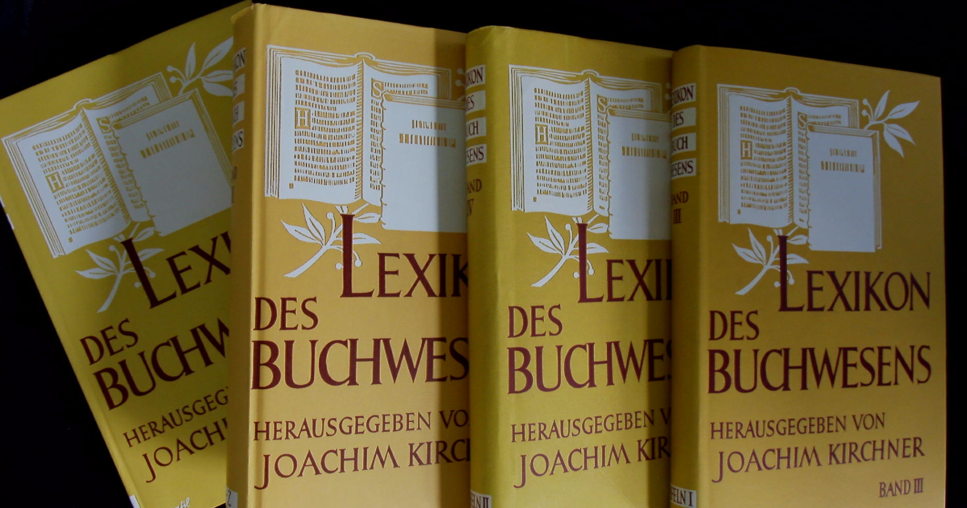 KIRCHNER, Joachim: (Hrsg.) Lexikon des Buchwesens. 2 Text und 2 Bildbände. 4 Bände. Stuttgart (Hiersemann), 1952-1956. VIII, 405; VII, 519; XXXIX, 320; XLVII, 343 S. mit insg. 957 Abb. auf 644 Tafeln. OLn mit OUmschl. tadellos. 1. ill. Ausgabe.