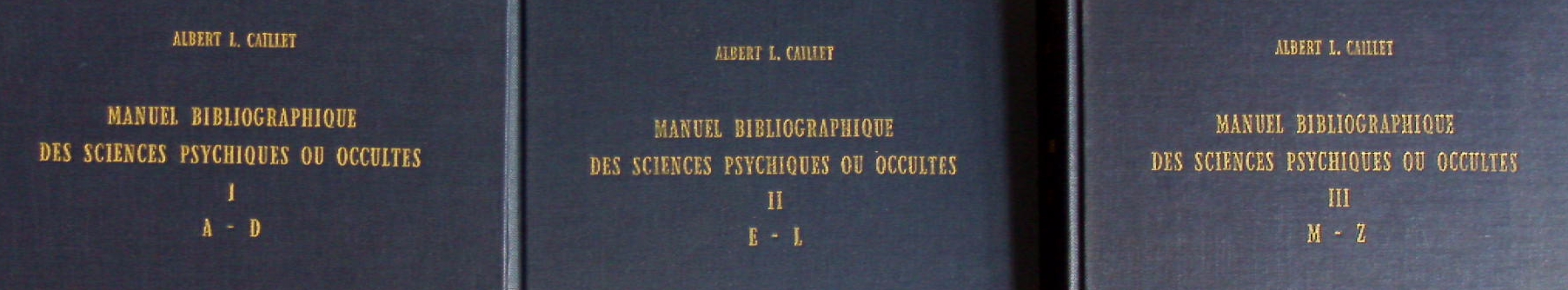 GRENZWISSENSCHAFTEN.– CAILLET, Albert L.: Manuel bibliographique des sciences psychiques ou occultes. Sciences des Mages – Hermétique – Astrologie – Kabbale – Franc Maçonnerie – Médicine ancienne – Mesmerisme – Sorcellerie – Singularités – Aberrations de tout ordre – curiosités. Sources Bibliographique et Documents sur ces sujets etc. Réimpr. der Ausg. Paris 1912. 3 Bände. Nieuwkoop (de Graaf), 1964. Gr. 8°. LXVII, 531, 533, 767 S. OLn mit Goldprägung. feines Ex. Umfangreiche Standardbibliographie zum Okkultismus.