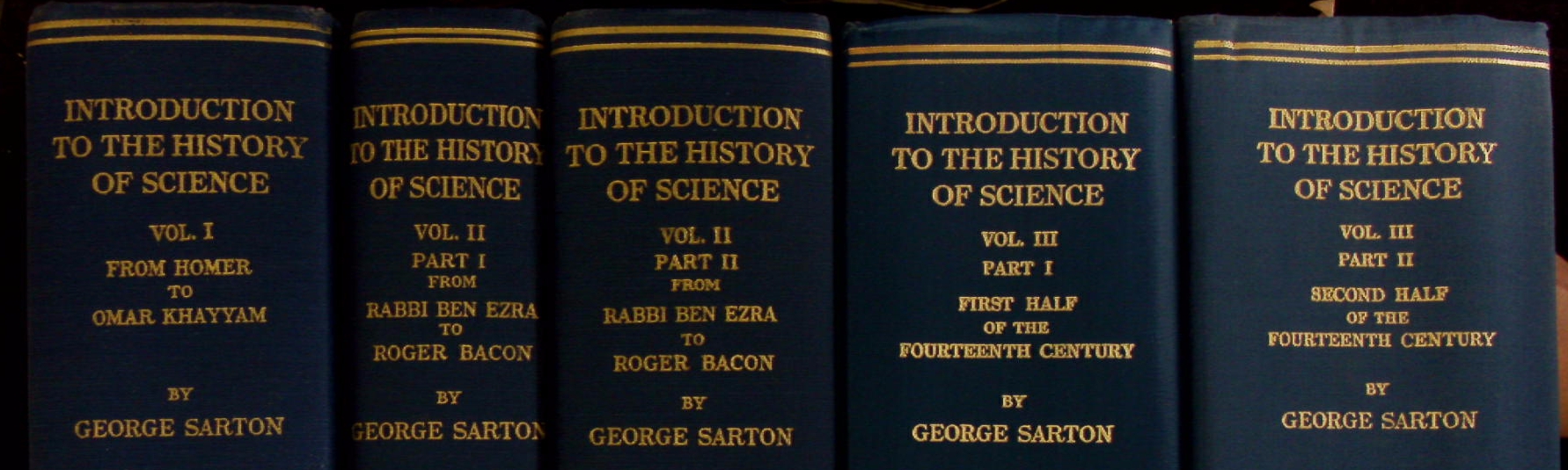 WISSENSCHAFT.– SARTON, George: Introduction to the History of Science. Vol. I: From Homer to Omar Khayyam. Vol. II: From Rabbi ben Ezra to Roger Bacon (2 vols). Vol. III: Science and Learning in the fourteenth Century (2 vols). 3. Auf. der Repr. d. Ausg. 1927-1948. 3 Volumes complete in 5 Books. Washington (Carnegie), 1967 XI, 839; XXXV, XVI, 1251; XXXV, X, 2155 Seiten mit einigen s/w Abbildungen. OLn mit Goldprägung. Vorsätze mit leichten Klebespuren, sonst tadellos erhalten. George Alfred Leon Sarton (* 31. August 1884 in Gent, Belgien; † 22. März 1956 in Cambridge, Massachusetts, Vereinigte Staaten) war ein belgisch-US-amerikanischer Naturwissenschaftshistoriker. (Wikipedia)