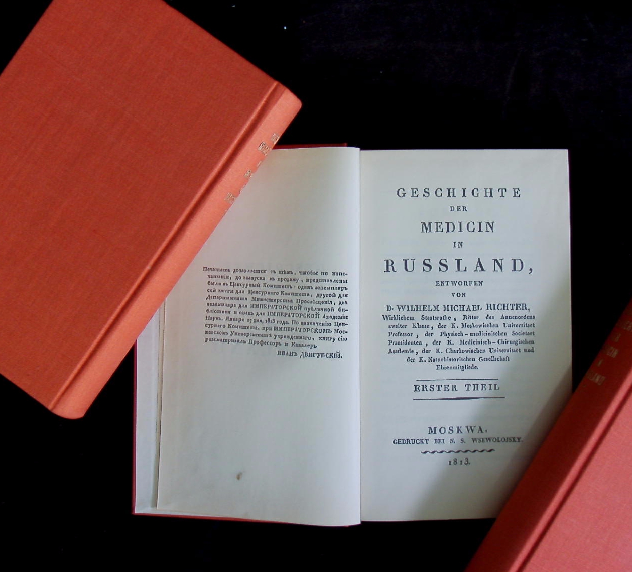 MEDIZIN.– RICHTER, Wilhelm Michael von: Geschichte der Medicin in Russland. Unveränd. Nachdr. der Orig.-Ausg. Moskwa, 1813-1817. 3 Bände. Leipzig (Zentral-Antiquariat der DDR), 1965. XXIII, 457, XXXII, 440, 179, XXXII + 629 S. orangenes OLn. Vorsätze mit leichten Kleberesten,. sonst gut erhalten.