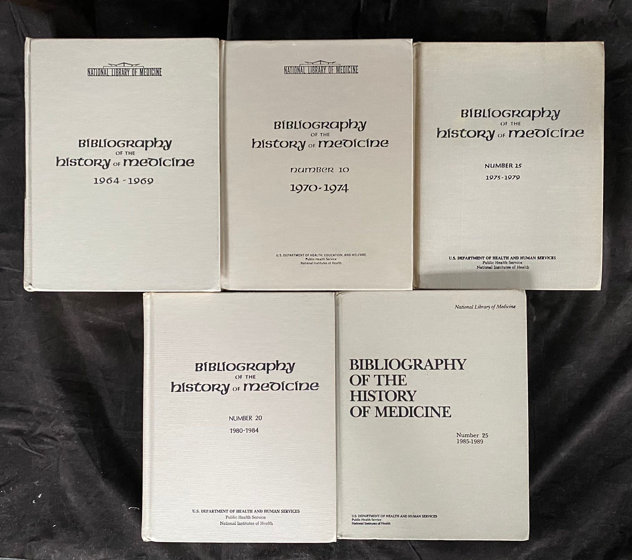 MEDIZIN.– NATIONAL LIBRARY OF MEDICINE: Bibliography of the history of medicine. 5 Bände. Bethesda (US Gov. Print.), 1964 – 1989. je Band über 1000 S. OLn. Rückdeckel des Bandes 1975-79 stärker angeschmutzt, sonst sehr ordentlich. Umfangreiche in sich geschlossene Reihe des US Bestandes zur Geschichte der Medizin.