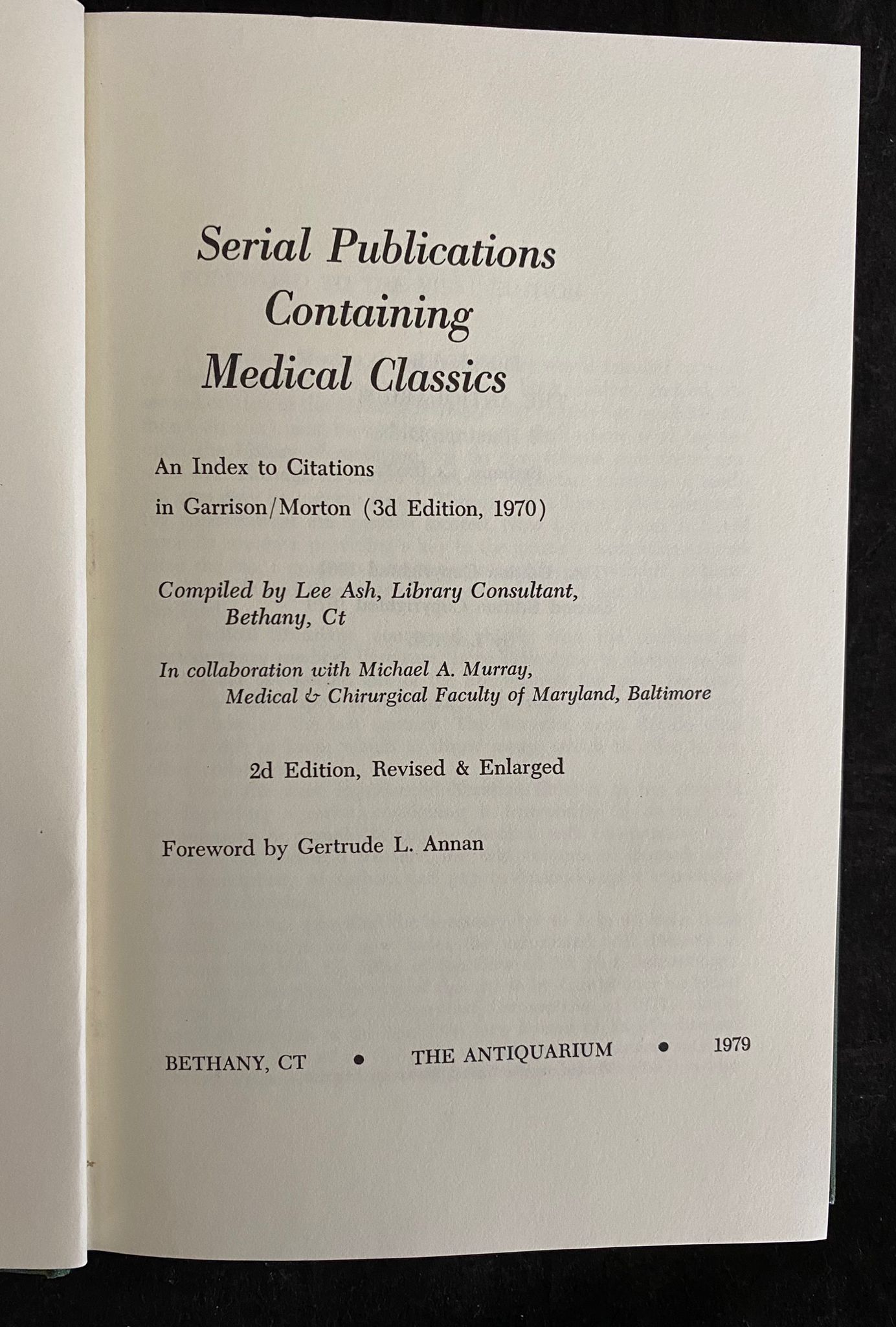 MEDIZIN.– ASH, Lee + MURAY, Michael A.:: Serial publications containing medical classics. An index to citations in Garrison/Maorton (3. ed., 1970). 2. ed., rev. & enlarged. Bethany (The Antiquarium), 1979. X, 167 S. OLn. Einband leicht bestaubt.