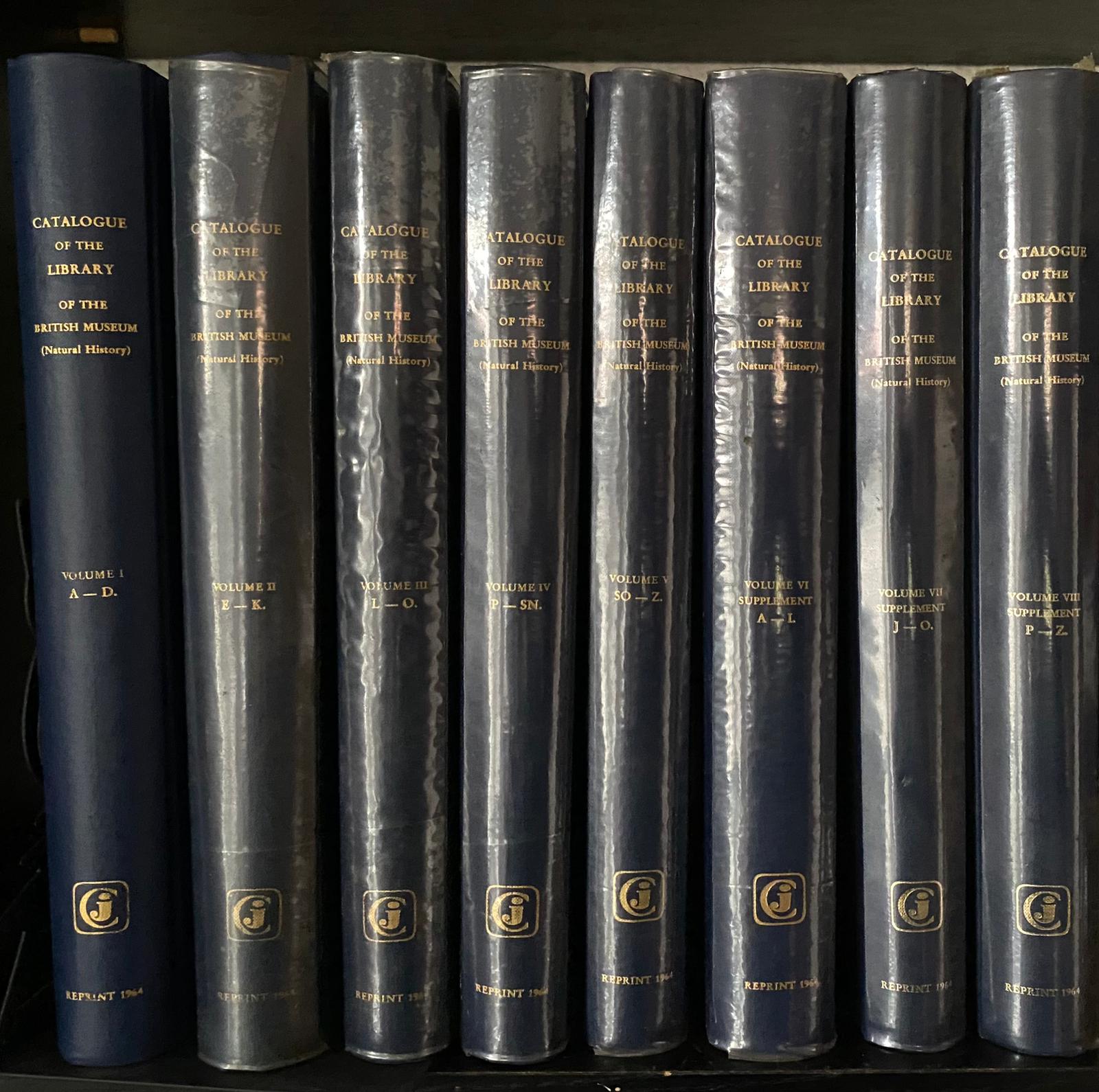 WISSENSCHAFT.– WOODWARD, B.B. & A.C. TOWNSEND (a.o., compilers): Catalogue of the books, manuscripts, maps and drawings in the British Museum (Natural History) Reprint der Ausgabe London, Printed by Order of the Trustees, 1903-1940. 8 Bände. Codicote, Weinheim (Wheldon & Wesliy + Cramer), 1964. ca 4000 S. blaue OLn mit goldgeprägten Rücken. Vorsätze mit leichten Kleberesten, sonst sehr gut. The British Museum Library is one of the world’s finest collections on natural history and this catalogue is an indispendable reference work for all libraries. Wird sehr selten angeboten.