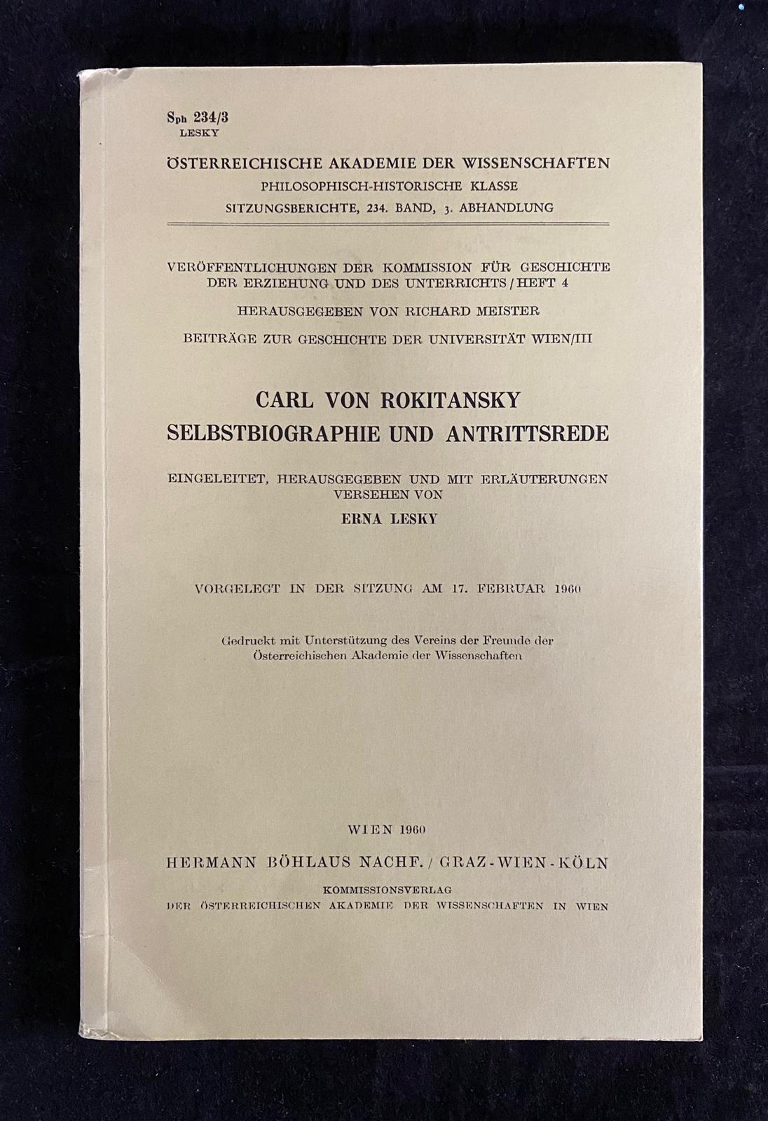 MEDIZIN.– ROKITANSKY, Karl Frh. v.: Selbstbiographie und Antrittsrede. Eingel. hrsg. von Erna Lesky. Vorgelegt in der Sitzung am 17. Febr. 1960. Wien (Böhlau), 1960. 111 S. mit Titelportrait. OKart. Vorsätze mit Klebespuren an den Ecken . = Veröffentlichungen der Kommission für Geschichte der Erziehung und des Unterrichts, 4. EA.