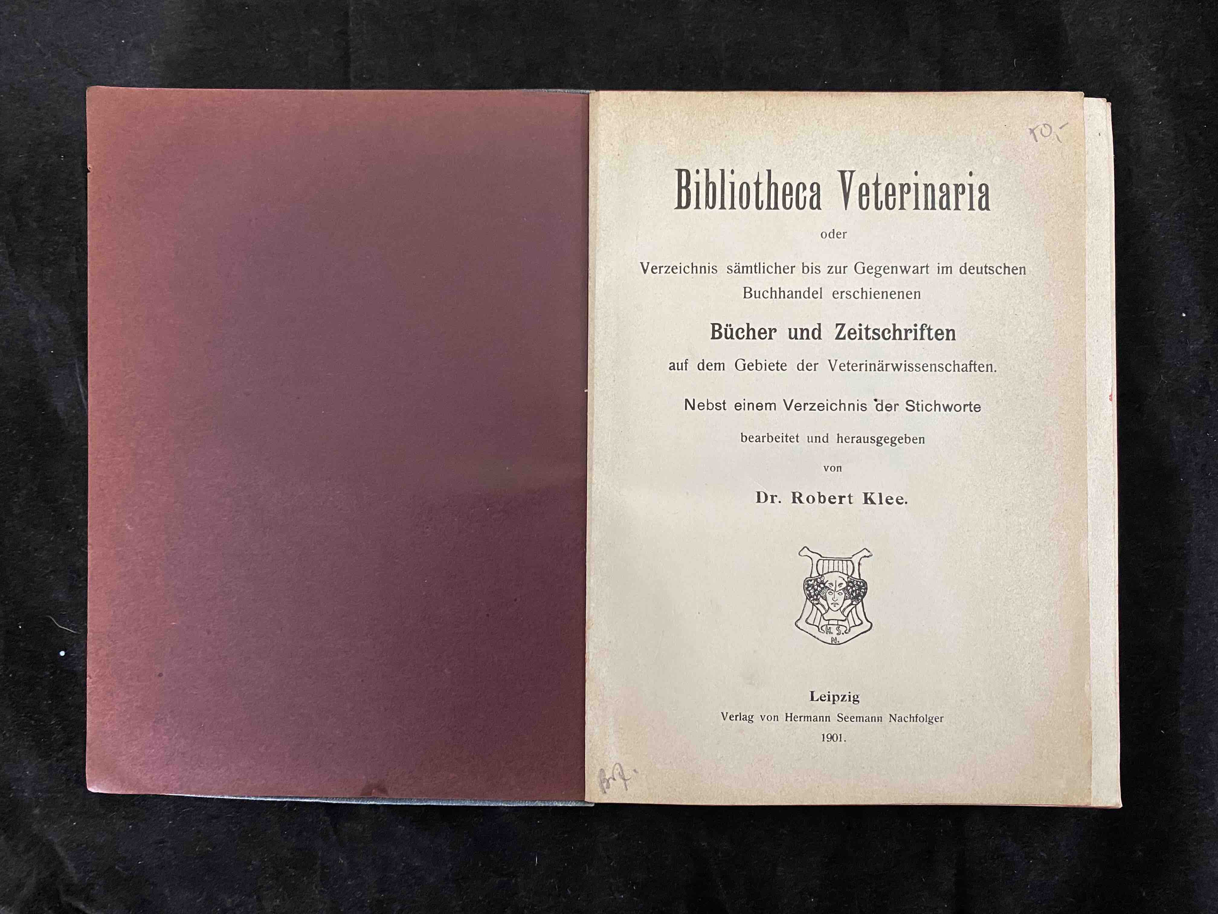 TIERMEDIZIN.– KLEE, Robert: Bibliotheca veterinaria. oder Verzeichnis sämtlicher bis zur Gegenwart im deutschen Buchhandel erschienen Bücher und Zeitschriften auf dem Gebiete der Veterinärwissenschaften. Nebst einem Verzeichnis der Stichworte. Leipzig (Seemann), 1901. kl.8°. 247 S. OLn. Einband etwas angeschmutzt. EA.