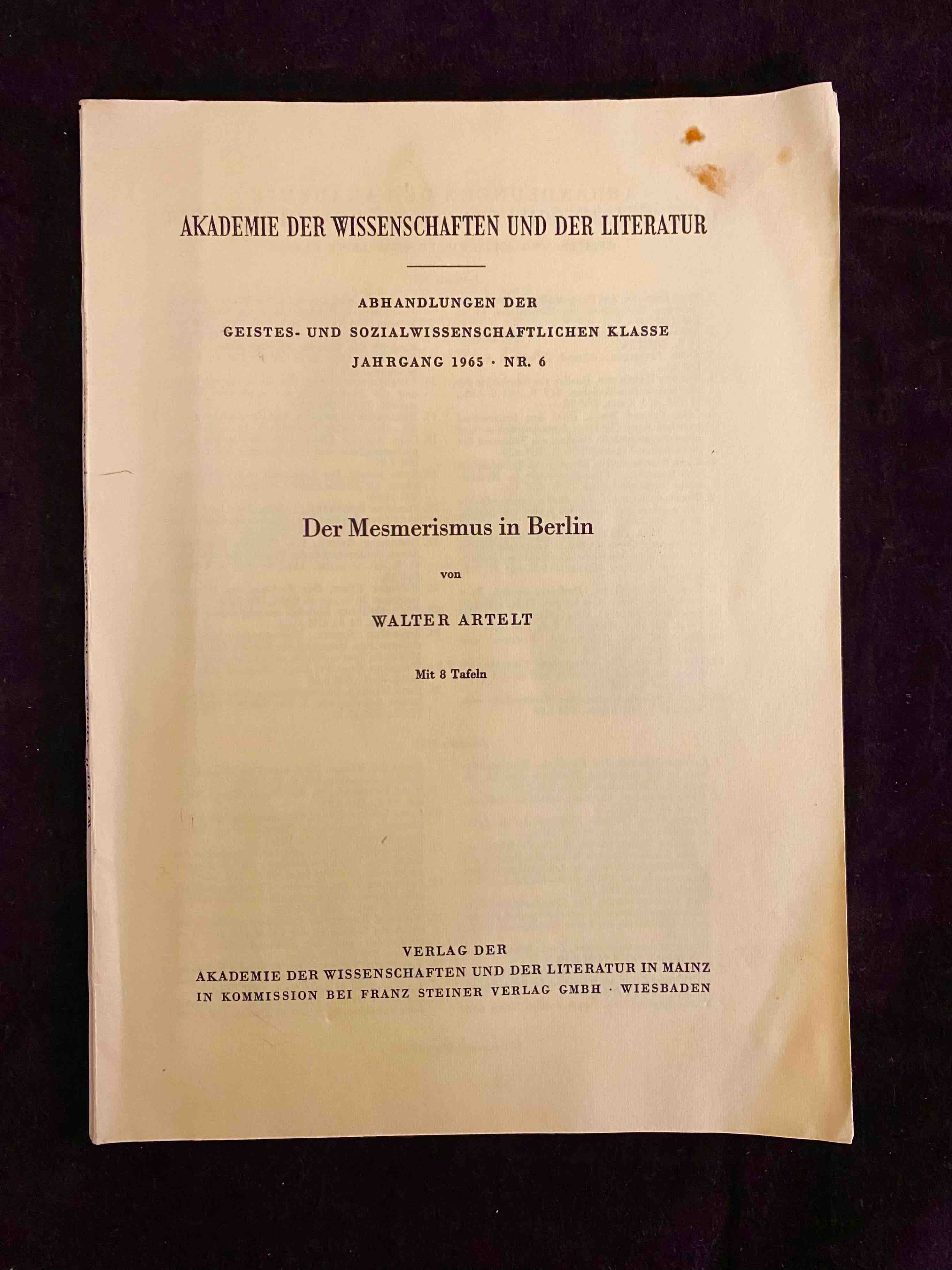 GRENZWISSENSCHAFTEN.– ARTELT, Walter: Der Mesmerismus in Berlin. Mainz (Akademie der Wissenschaften u.d. Literatur), 1965. 4°. 88 S., 8 S. Abb. mit 8 Taf. OBr. einige Bleistiftmarginalien, sonst gut. = Abhandlungen / Akademie der Wissenschaften und der Literatur, Geistes- und Sozialwissenschaftliche Klasse, Jg. 1965, Nr. 6. seltene EA. Walter Artelt (* 23. Juli 1906 in Warmbrunn (Niederschlesien); † 26. Januar 1976 in Königstein im Taunus) war ein deutscher Arzt, Zahnarzt und Medizinhistoriker. (Wikipedia)