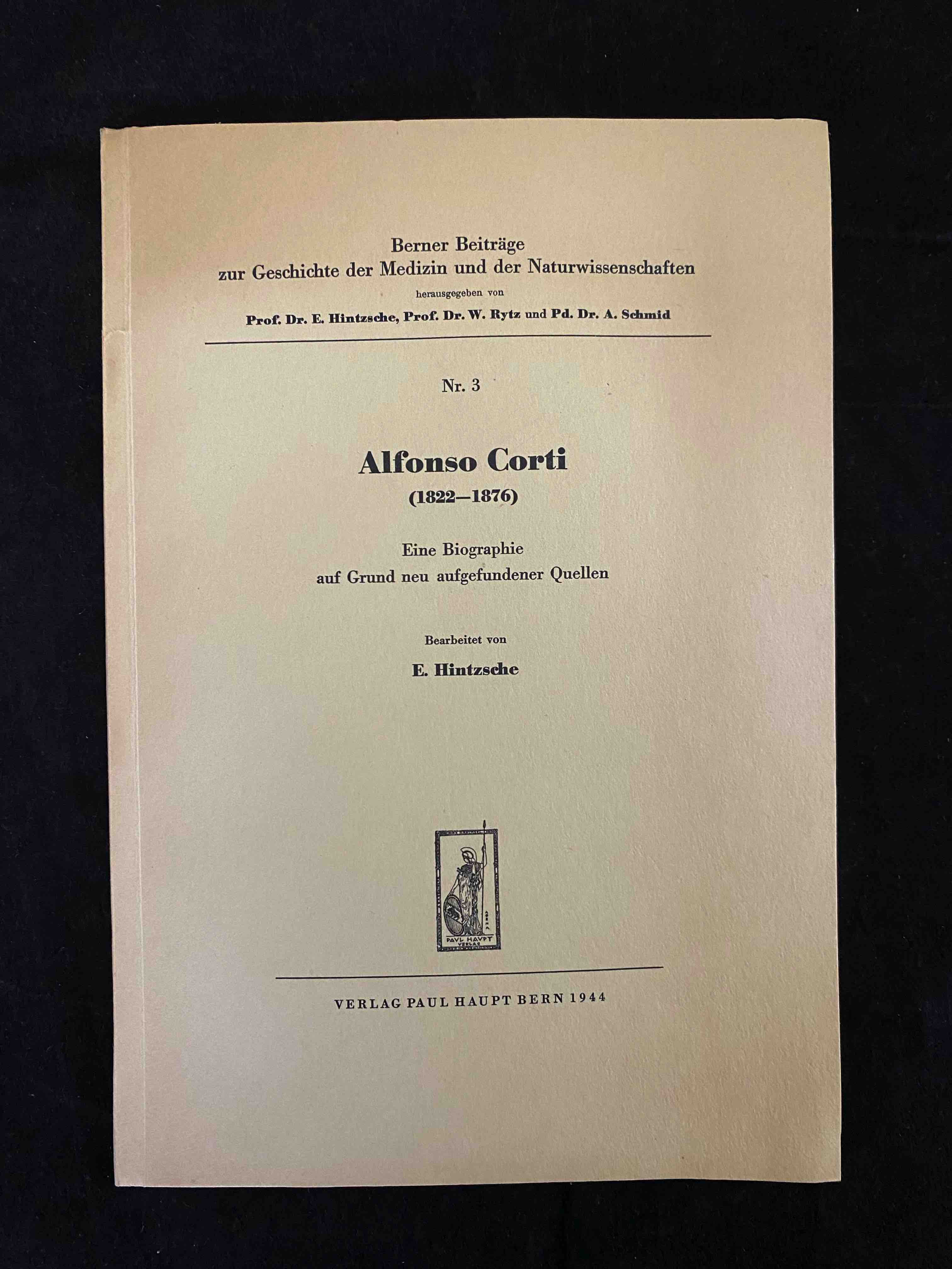 WISSENSCHAFT.– HINTZSCHE, Erich: Alfonso Corti (1822-1876). Eine Biographie auf Grund neu aufgefundener Quellen. Bern (Haupt), 1944. Gr. 8. 44 S. OKart. = Berner Beiträge zur Geschichte der Medizin und der Naturwissenschaften, Nr 3. seltene EA.