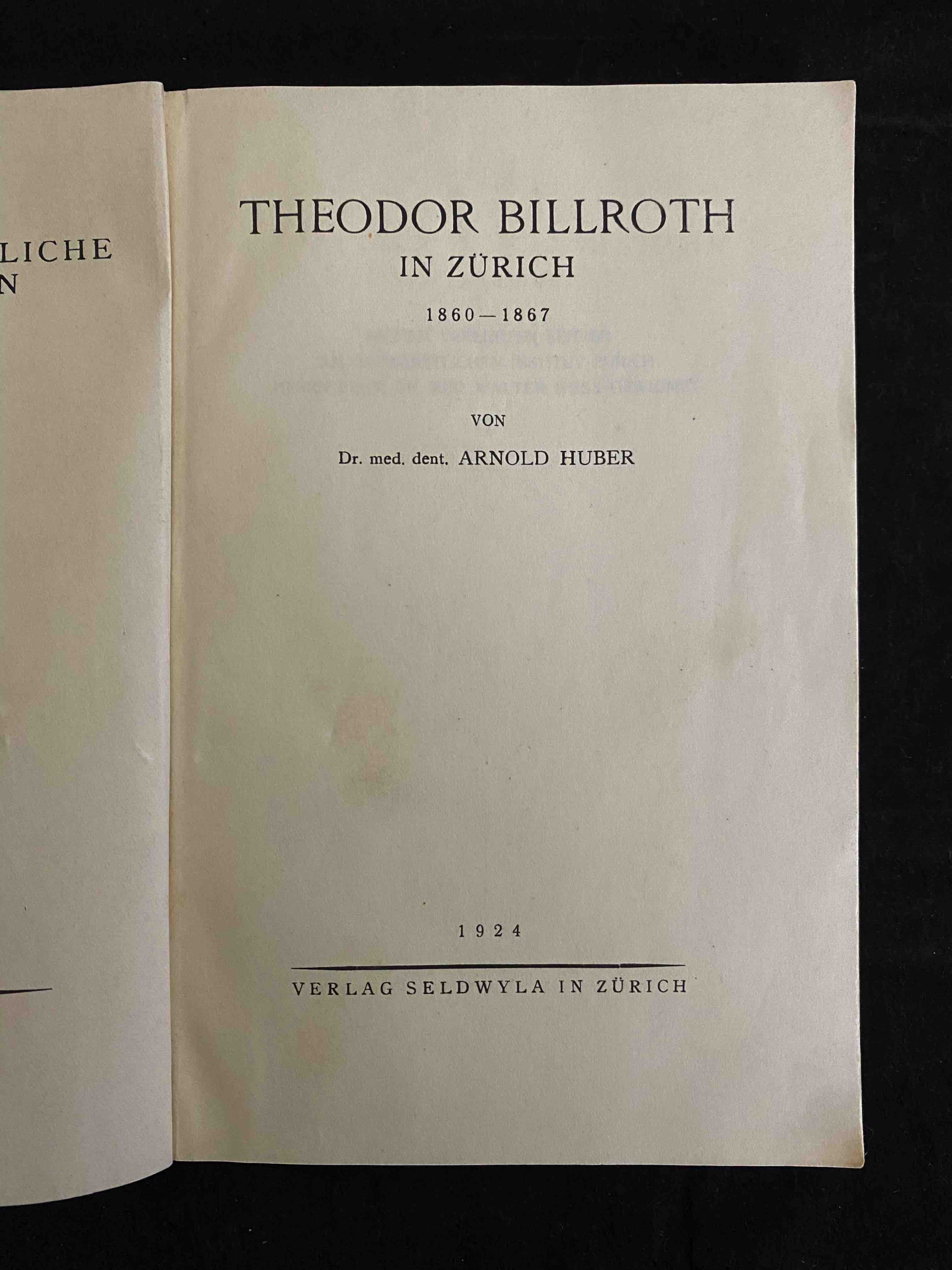 MEDIZIN.– HUBER, Arnold: Theodor Billroth in Zürich 1860-1867. Zürich (Seldwyla), 1924. Gr. 8. XIV, 192 S. mit 6 Tafeln. OBr. Einband etwas angeschmutzt, einige Bleistiftmarginalien. = Zürcher medizingeschichtliche Abhandlungen, 1. seltene EA.