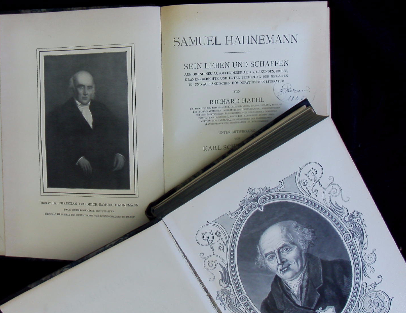 HOMÖOPATHIE.– HAEHL, Richard + SCHMIDT-BUHL, Karl: Samuel Hahnemann. Sein Leben und Schaffen auf Grund neu aufgefundener Akten, Urkunden, Briefe, Krankenberichte und unter Benützung der gesamten in- und ausländischen homöopathischen Literatur. 2 Bände. Leipzig (Schwabe), 1922. XVI, 508, XVI, 527 S. mit 2 Portraits und zahlr. Abb. OHLdr. vorderes Gelenk von Band 2 gelockert, sonst gutes Ex. EA. Die klassische Hahnemann Biographie.