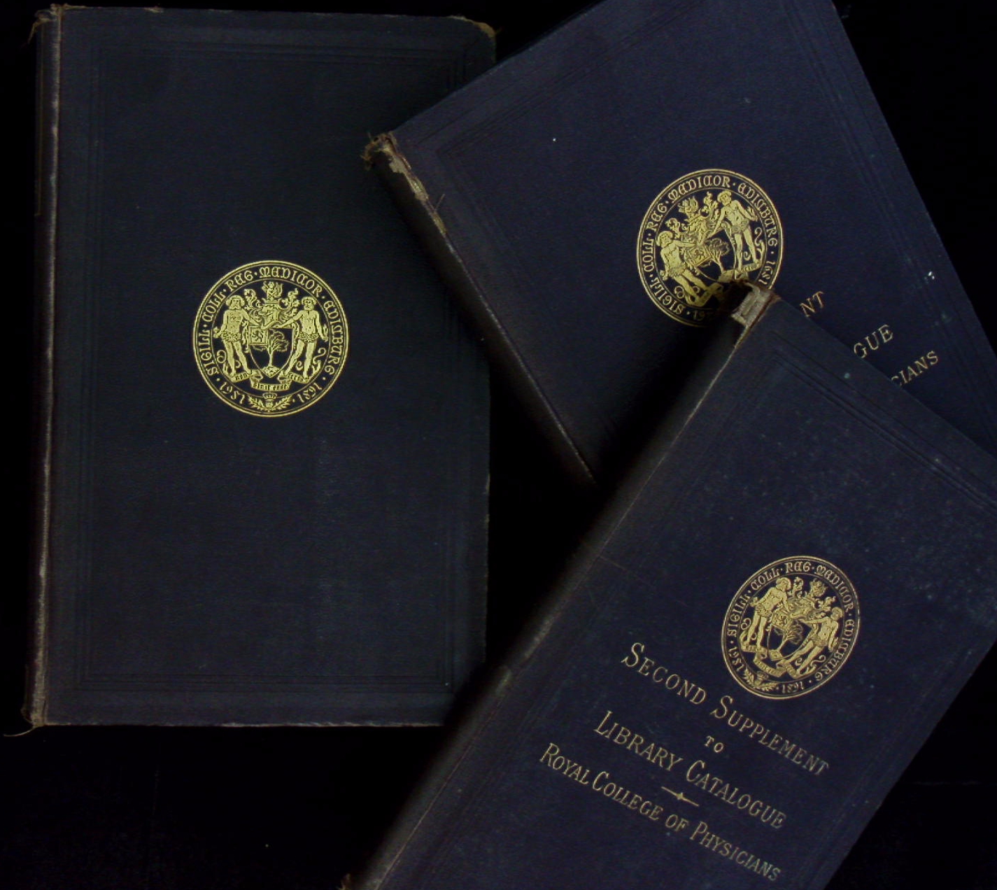 KATALOGE.– ROYAL COLLEGE OF PHYSICIANS OF EDINBURGH: Catalogue of the library. Hauptband und 2 Supplemente. 3 Bände. Edinburgh (Clark), 1863, 1870, 1879. XXVII, 764 S. mit Kopf- und Titelvignette in Band 1 sowie VII, 279, VIII, 162 S. mit jeweils eine lithogr. Hausansicht als Titelbild in den Supplementen. OLn mit goldgeprägter Deckelvignette und Kopfgoldschnitt. Ecken etwas bestoßen, sonst gut erhalten. EA