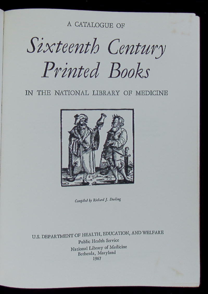 INKUNABELN.– DURLING, Richard J.: A catalogue of sixteenth century printed books in the National Library of Medicine. Bethesda (U.S. Department of Health, Education, and Welfare), 1967. 4°. XII, 698 S. mit Abb. ill. OLn. Vorsätze leicht fleckig. EA. Beschreibt 4800 Titel, gedruckt zwichen 1501 und 1600.