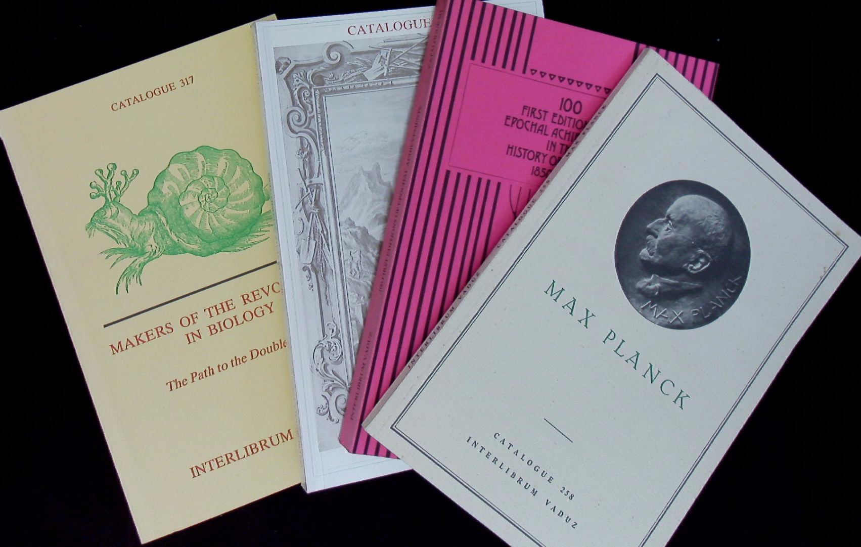 KATALOGE.– INTERLIBRUM VADUZ: 4 Antiquariatskataloge. No 258, 309, 311 und 317. Max Planck. From Crystals to Computers. 100 First Editions in the History of Sciences. Makers of the Revolution in Biology. 4 Bände. Vaduz, ca 1980 ff. Gr. 8°. jeweils ca 300 S. mit zahlr. Bildern. ill. OKart. feines Ex.