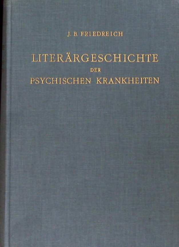 MEDIZIN.– FRIEDREICH, Johannes B.: Versuch einer Literärgeschichte der Pathologie und Therapie der psychischen Krankheiten. Von den ältesten Zeiten bis zum neunzehnten Jahrhundert. Nachdr. der Ausg. Würzburg / Strecker, 1830. Amsterdam (Bonset), 1965. VIII, 655 S. OLn mit Goldprägung. Vorsätze mit Kleberesten.