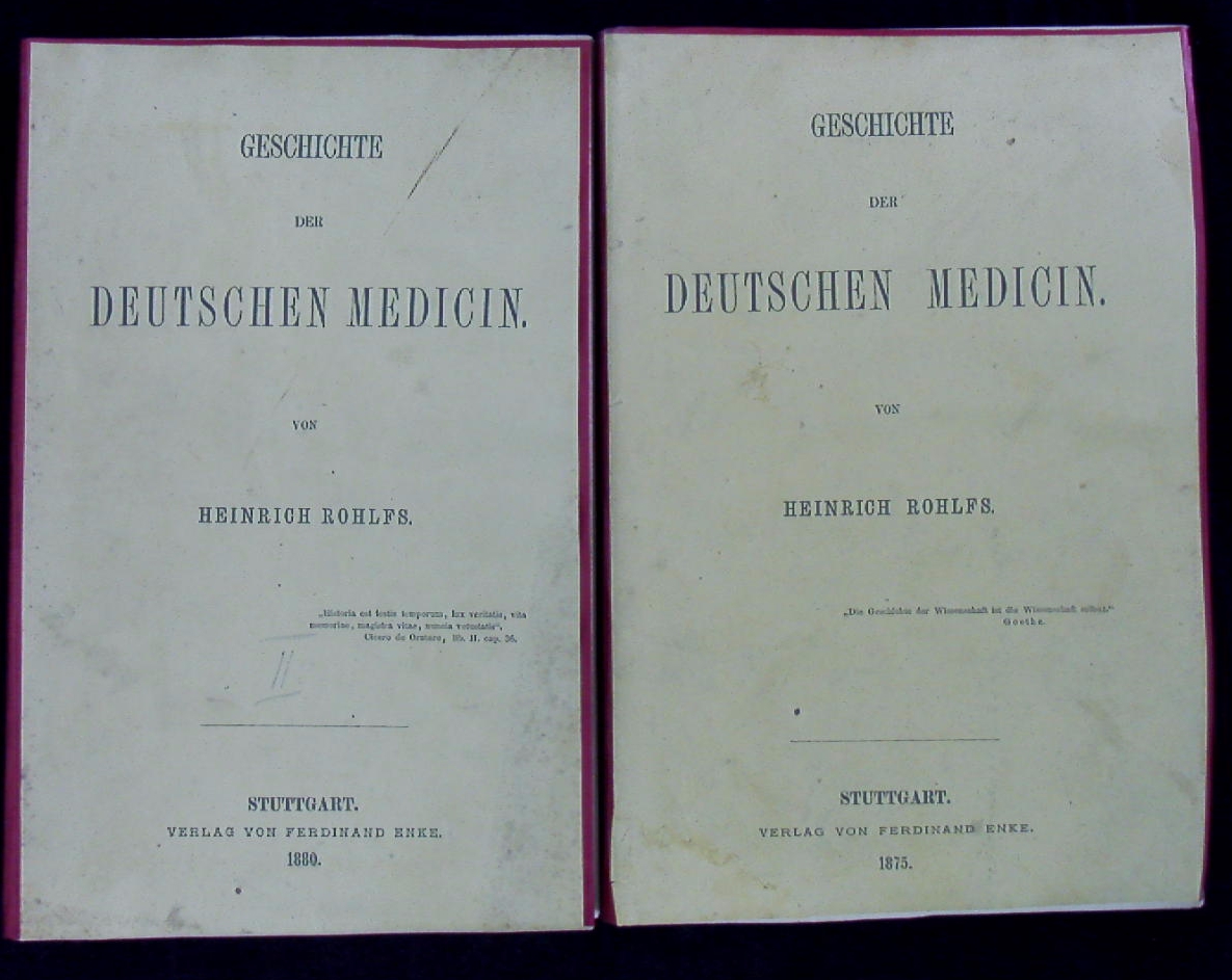 MEDIZIN.– ROHLFS, Heinrich: Die medicinischen Classiker Deutschlands. 2. Abt. 2 Bände. 1875 + 1880. XVI, 556, X, 566 S., 3 Bl. späterer Kart unter Verwendung der OKart. Vorsätze mit Kleberesten, die letzten Seiten des 2. Bandes an einer Ecke gering lädiert. EA. Heinrich Rohlfs (* 17. Juni 1827 in Vegesack bei Bremen; † 5. Mai 1898 in Wiesbaden) war ein deutscher Mediziner und Schriftsteller. Nach einem Medizinstudium, das ihn nach Göttingen, Berlin, Würzburg, Prag und Paris führte, nahm er als Militärarzt am Schleswig-Holsteinischen Krieg 1848–1851 teil. Im Sommer 1851 hielt er sich in Paris auf, wo er mehrmals Heinrich Heine besuchte.