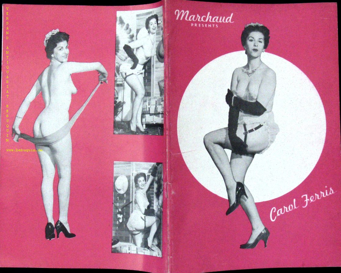 EROTIK.– MARCHAUD PRESENTS.– Carol Ferris. New York (Small Press), ca 1960. 16 Bl. mit zahlr. fotografischen Bildern des teils unbekleideten Pin Up Girls. farb. ill. OBr. gutes Ex. EA.