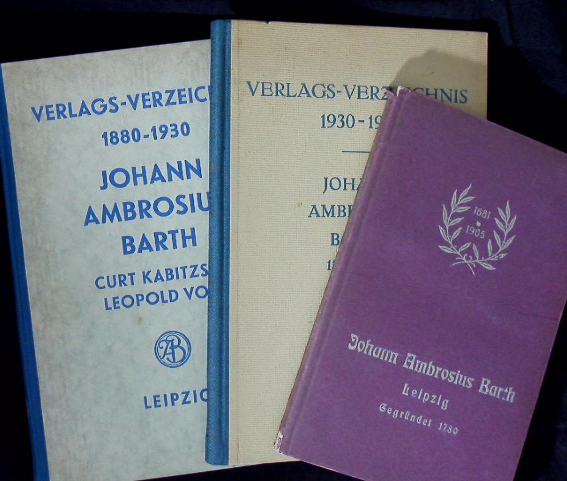 WISSENSCHAFT.– BARTH, Johann Ambrosius: 3 Verlags-Verzeichnisse. 1880 – 1930. + 1930 – 1955. + 1881 – 1905. 3 Bände. Leipzig (Barth), 1905, 1930 1955. gr. 8. ca 500 S. mit zahlr. Bildern OHLn und OPb. gering bestaubt. 3 EA mit einer interessanten eglaufenen Postkarte des Verlagsleiters von 1963 inliegend: „Bemerken möchte ich noch, daß sämtliche Vorräte, die vor Beendigung des 2. Weltkrieges erschieben, durch Kriegseinwirkung vernichtet wurden.″