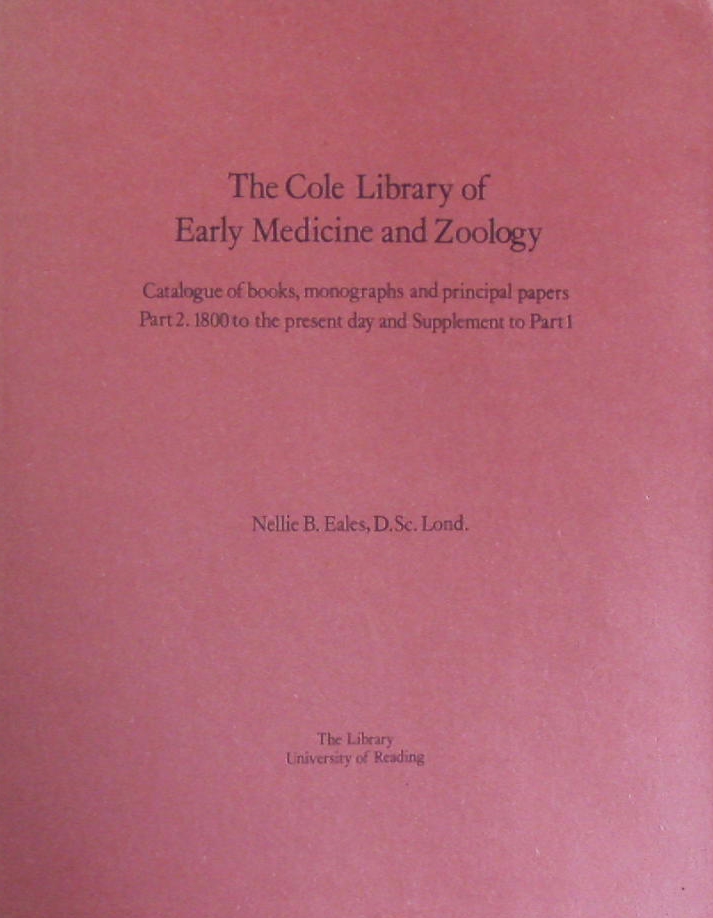 MEDIZIN.– EALES, Nellie Barbara: The Cole Library of Early Medicine and Zoology. Part 2: 1800 to the present day and supplement to part 1. Reading (Library), 1975. 4°. XVIII, 428 S. mit Titelbild. OKart. Vorsätze mit Kleberesten. = Reading University Library publications, 2.
