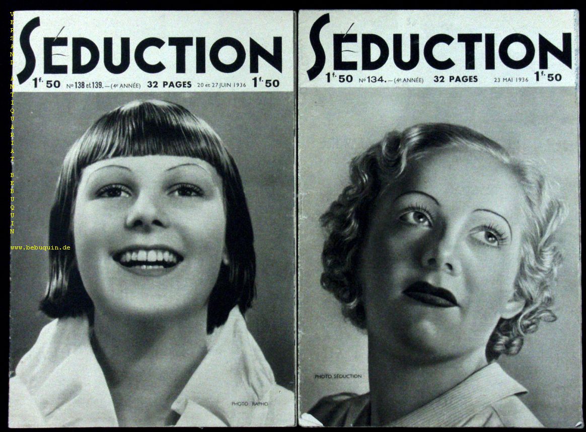 EROTIK.– SEDUCTION.– 5 Nummern der erotischen Zeitschrift. Nr. 134,138/39, 204, 253, 264. Sceaux, 1936 – 38. Gr. 8°. je 32 S. mit zahlr. teils fotografischen Bildern unbekleideter Frauen. ill. OBr. Kanten etwas bestoßen, sonst gutes Ex. EA.