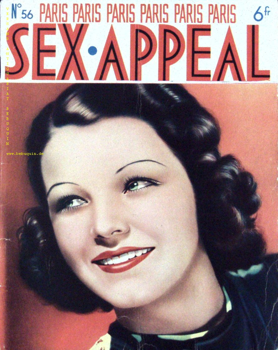 EROTIK.– PARIS SEX APPEAL.– No 56. Revue mensuelle le plus Parisien. Paris (Henri Francois), 1938. 4°. ca 50 S. mit zahlr. teils farb. fotografischen Bildern von zumeist unbekleideten Menschen. farb. ill. OKart. Rücken eingerissen, sonst feines Ex. EA.