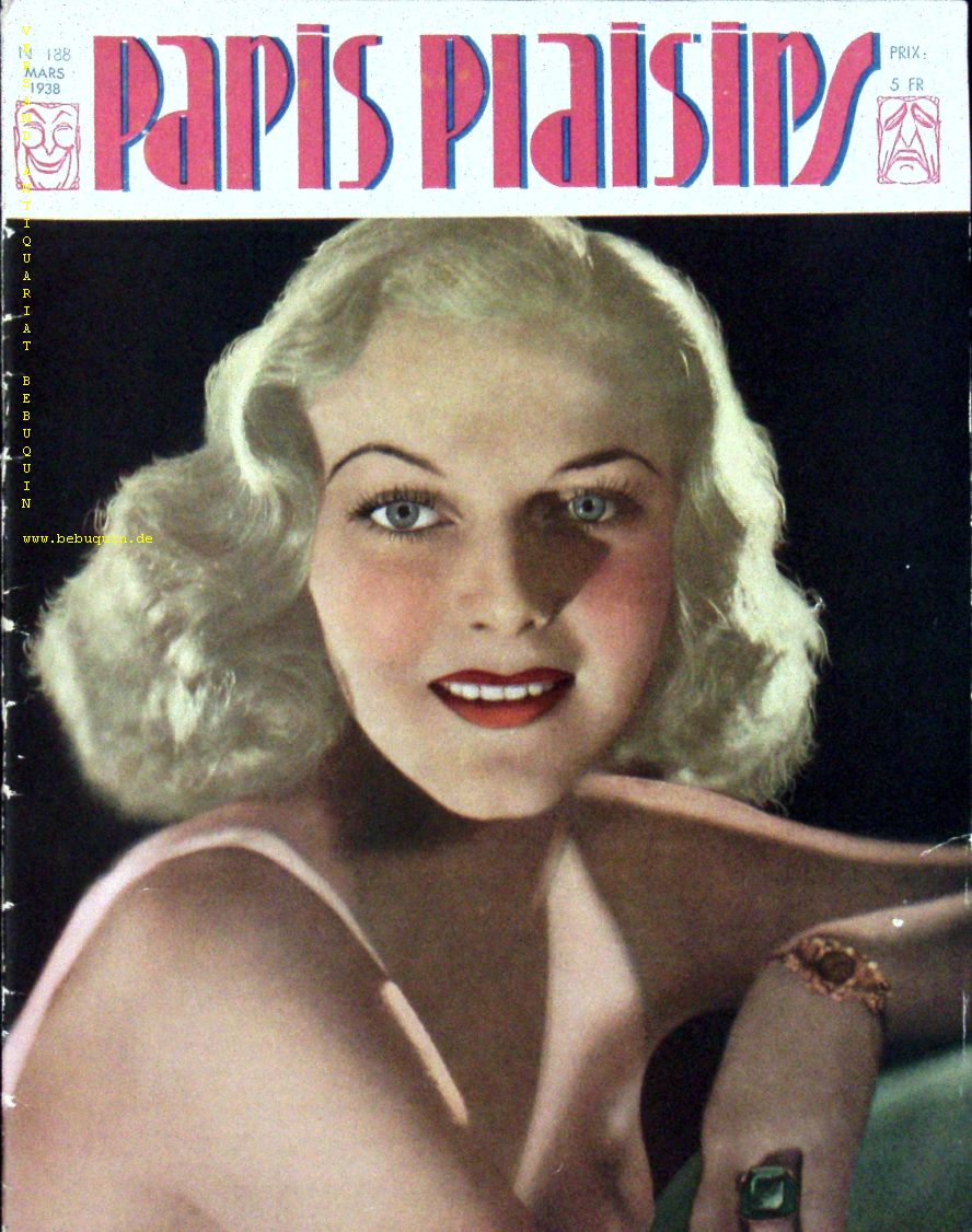 EROTIK.– PARIS PLAISIRS.– 1938. No. 188. Mensuel, esthetique, Homoristique et theatral. Paris, 1938. 4°. 38 S. mit zahlr. teils farb. fotografischen Bildern von zumeist unbekleideten Menschen. farb. ill. OKart. gutes Ex. EA.