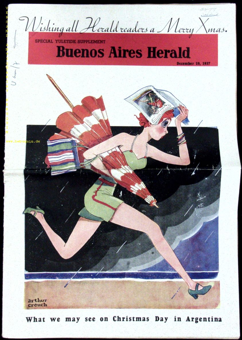 CROUCH, Arthur: Titelbild der Buenos Aires Herald vom 19. Dezember 1937.– Titel. What we may see on Christmas Day in Argentina. Buenos Aires, 1937. 40 x 27,5 cm. 28 S. mit zahlr. teils farb. Illustrationen und Fotografien. farb. ill. OBr. mittig gefaltet. EA. Crouch was a popular magazine cover artist of the 1930s-’50s, most notably for Collier’s, and often used yarn to illustrate ladies’ hair.