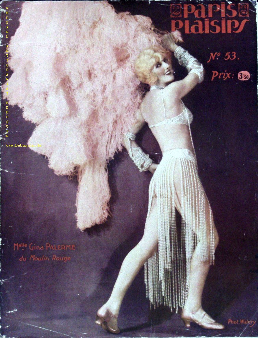 EROTIK.– PARIS PLAISIRS.– 1926. No. 53. Mensuel, esthetique, Homoristique et theatral. Paris, 1926. Gr.4°. 16 S. mit zahlr. teils farb. fotografischen Bildern von zumeist unbekleideten Menschen. farb. ill. OBr. Rücken berieben. EA.
