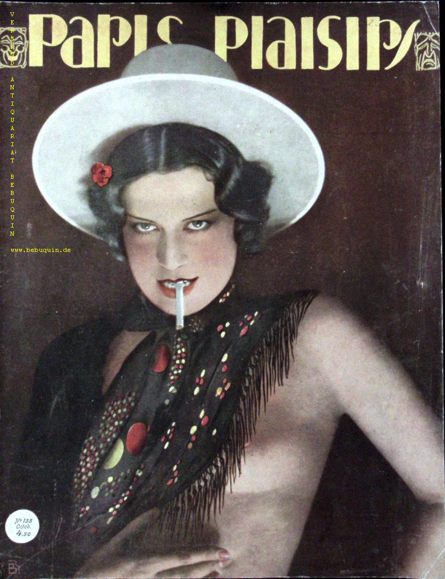 EROTIK.– PARIS PLAISIRS.– 1933. No. 135. Mensuel, esthetique, Homoristique et theatral. Paris, 1933. Gr.4°. 16 S. mit zahlr. teils farb. fotografischen Bildern von zumeist unbekleideten Menschen. farb. ill. OBr. Rücken berieben, leichte Blattläsuren. EA.